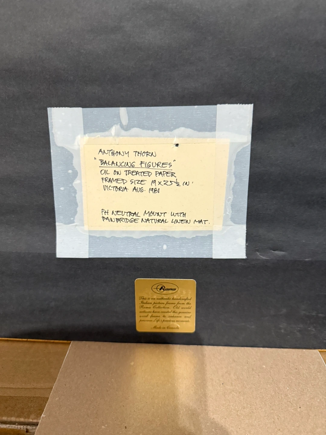 401This is a framed art piece by Anthony Thorn, titled "Balancing Figures"! It's an oil on treated paper, framed to a size of 19 x 25 1/2 inches. The piece is mounted with PH neutral mount with Bainbridge natural linen mat. It's a beautiful piece, perfect for adding a touch of elegance to any room. What a deal! Smoke free home. Cash only. Please pick up in Mississauga. All sales final and bundle offers are welcome. A freebie is included with every purchase.