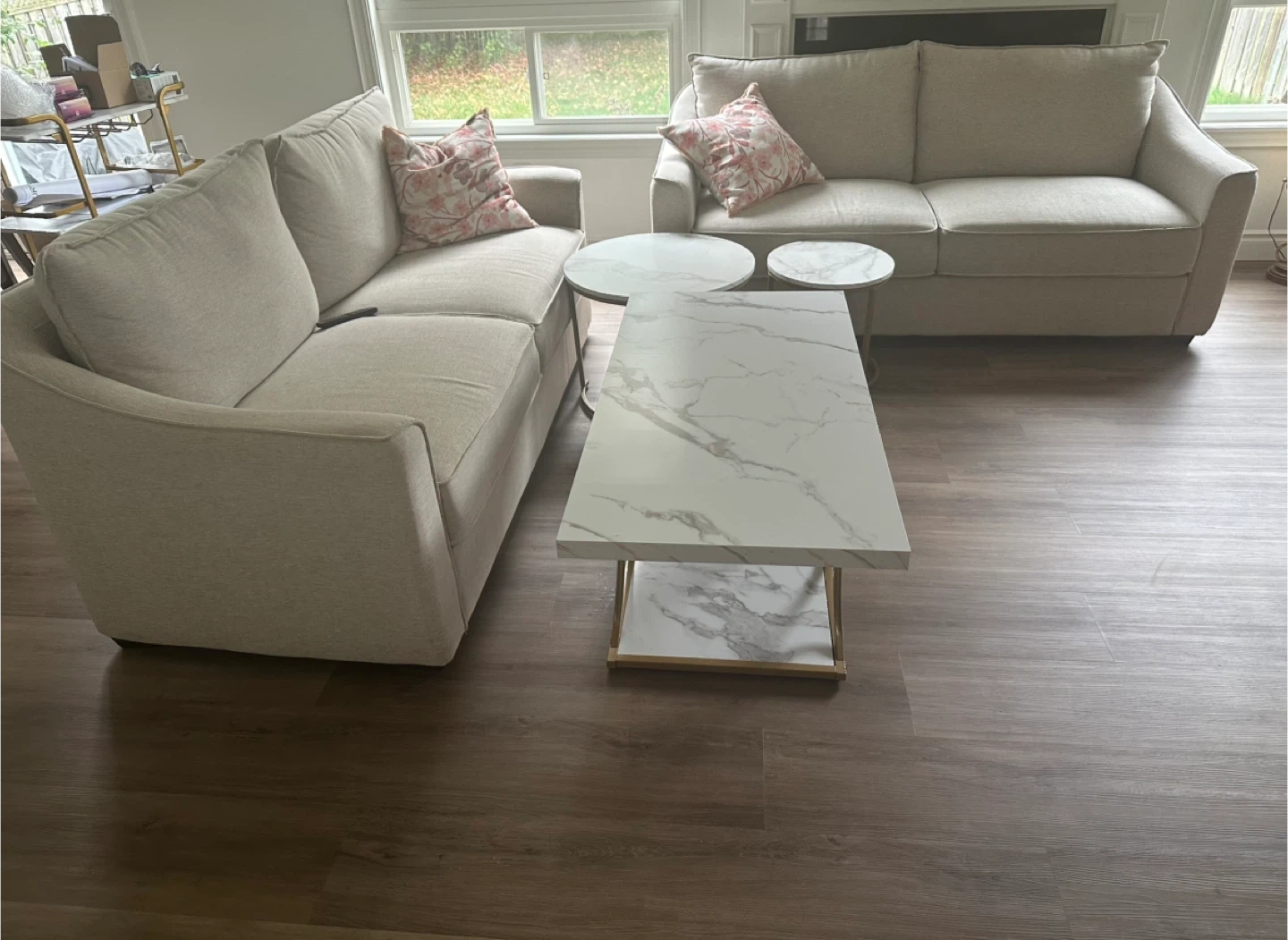 Selling a comfortable beige sofa set and Marble like tables set. It's in great condition and would look lovely in any living room. The neutral colour makes it easy to match with other furniture and decor! Feel free to message me with any questions