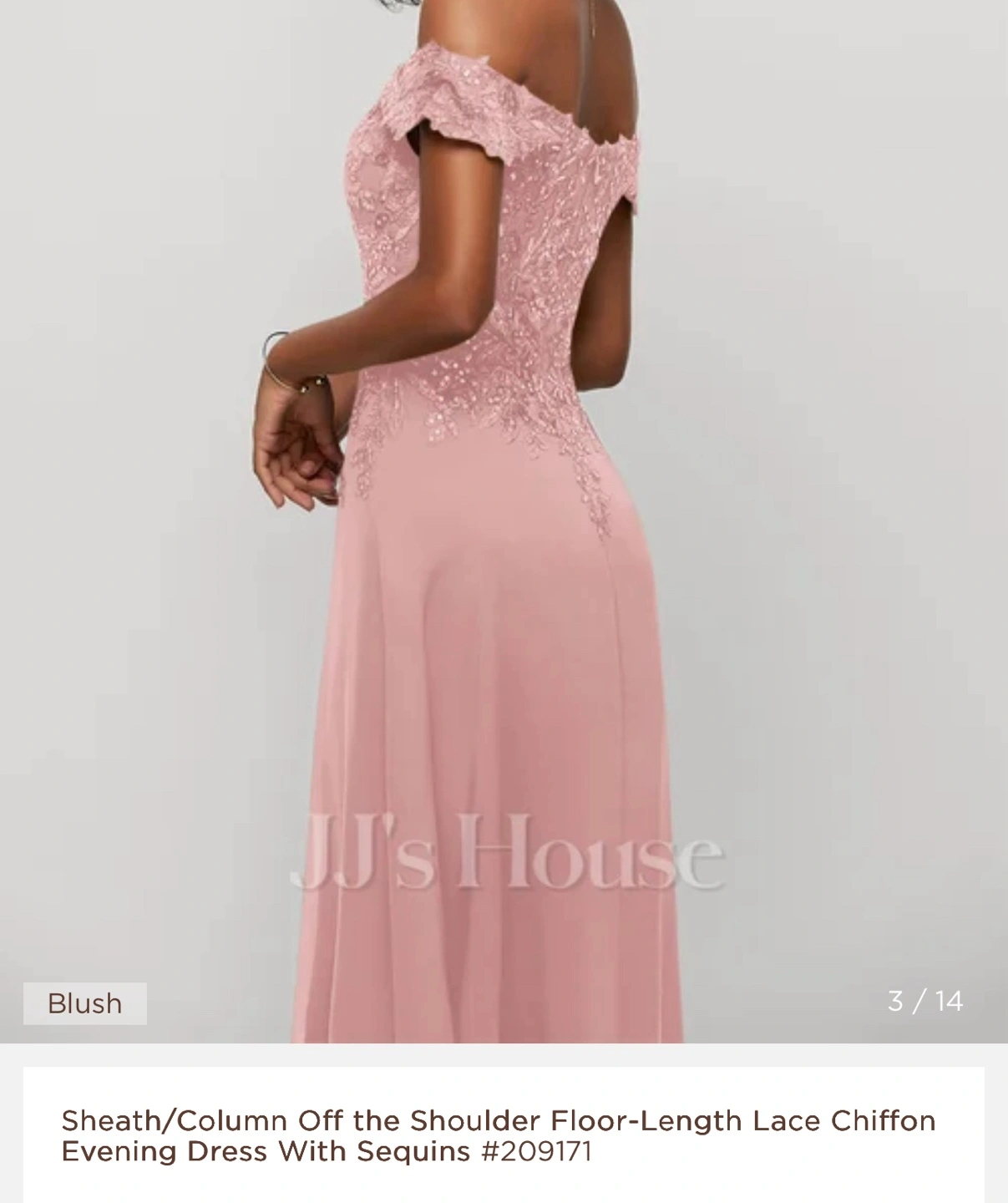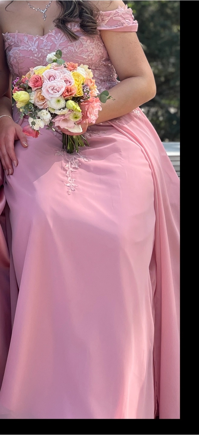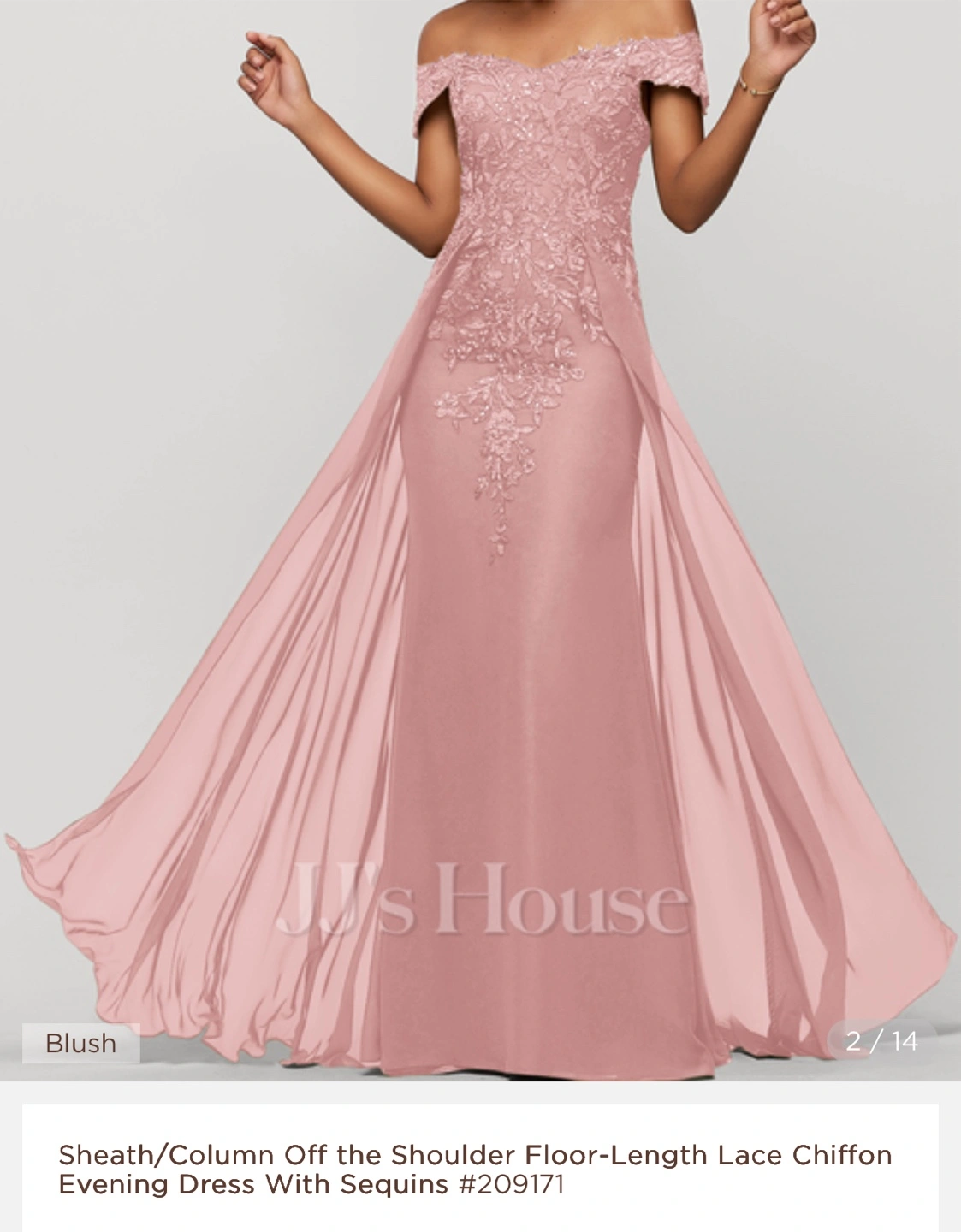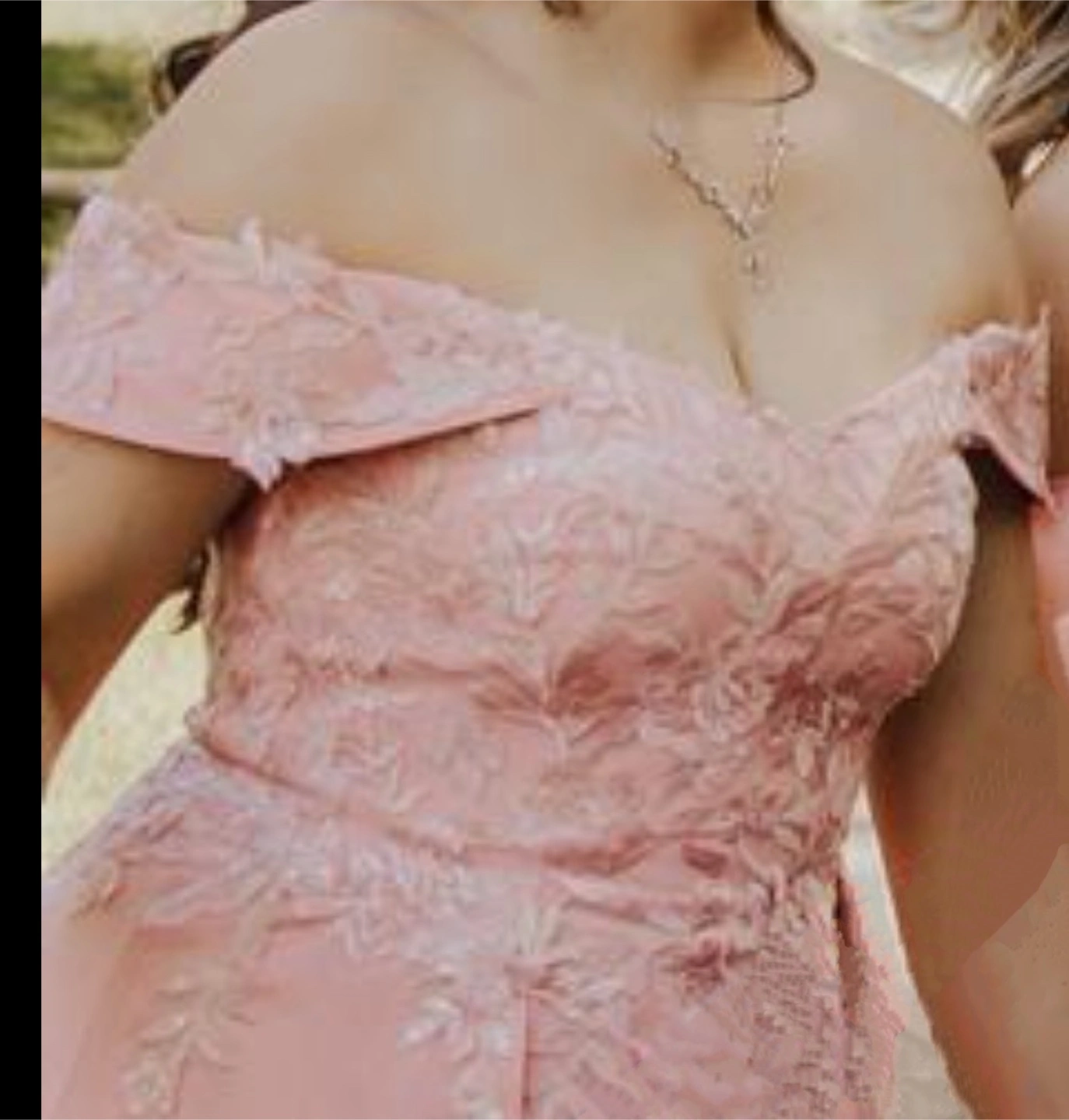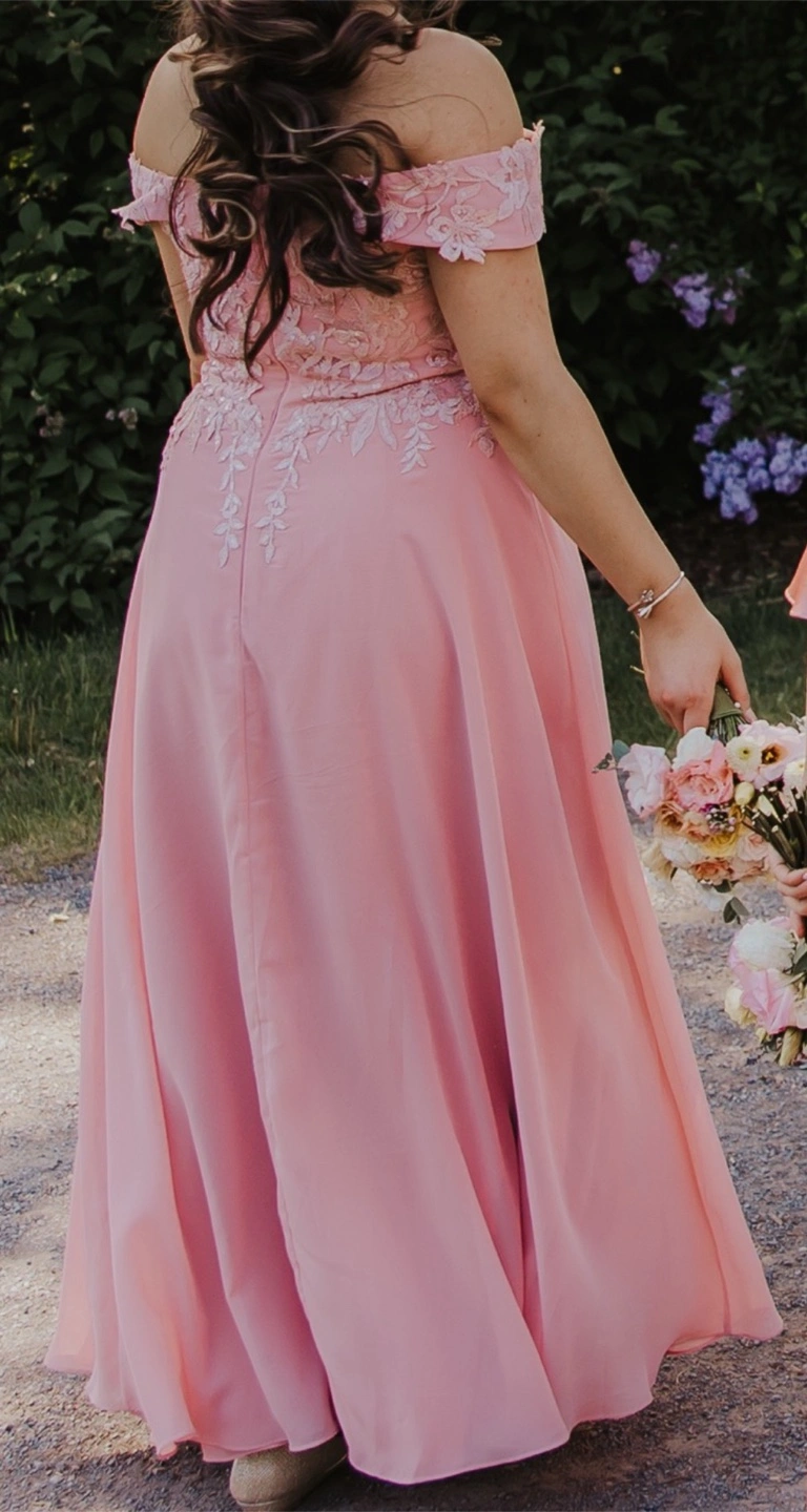A beautiful blush-coloured dress. Has an off-the-shoulder neckline with lace detailing on the bodice. The skirt is a light flowing chiffon material with overskirt layer for extra effect. Has very nice details up close. Worn once as a bridesmaid dress. Would be stunning for any formal occasion. Size 12 Women’s. Retail price was $307.