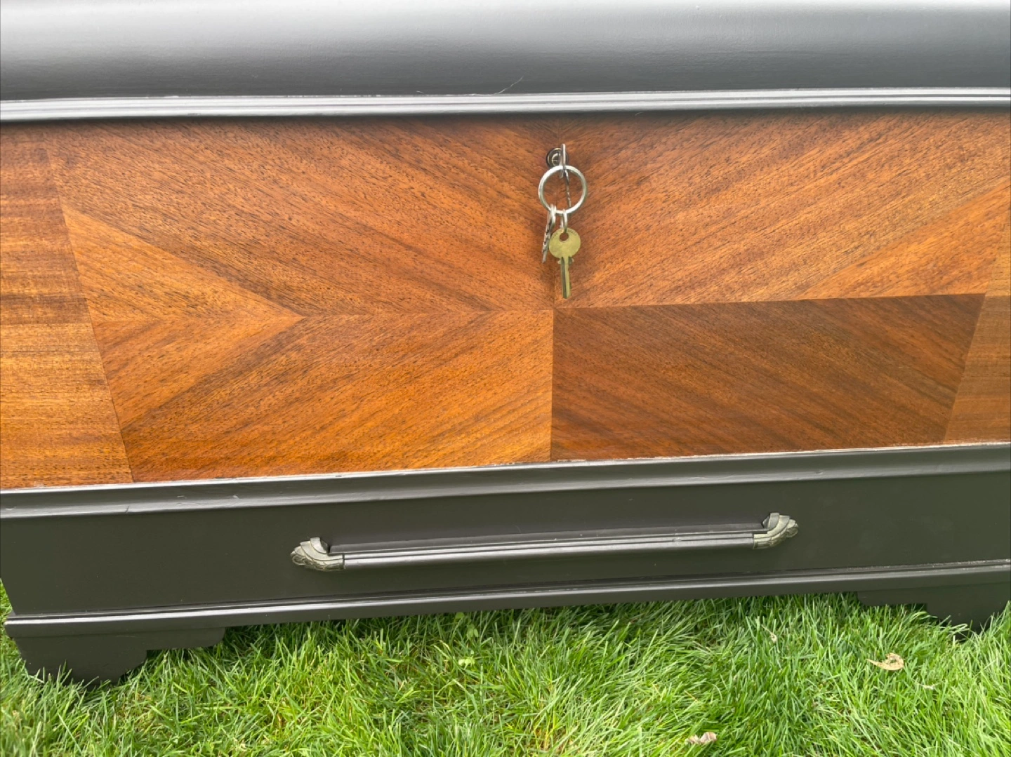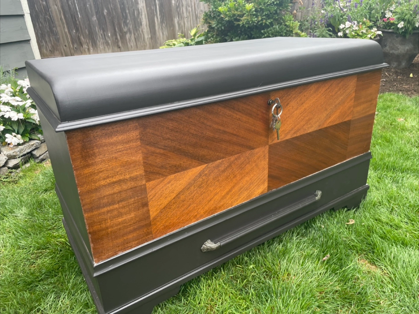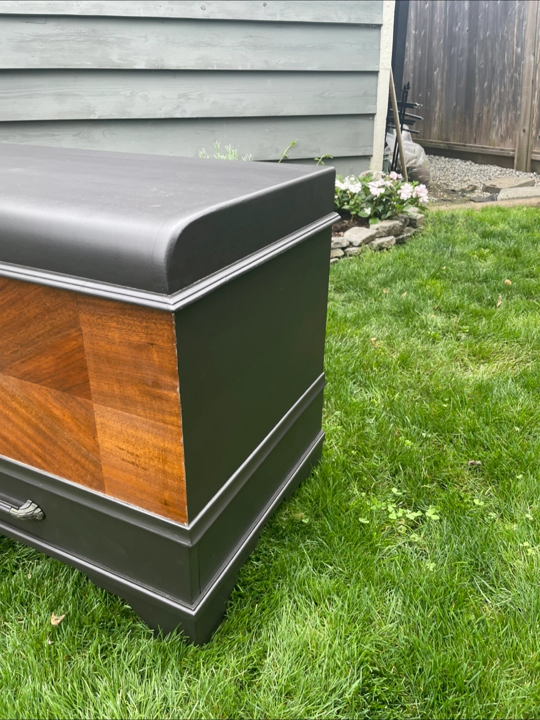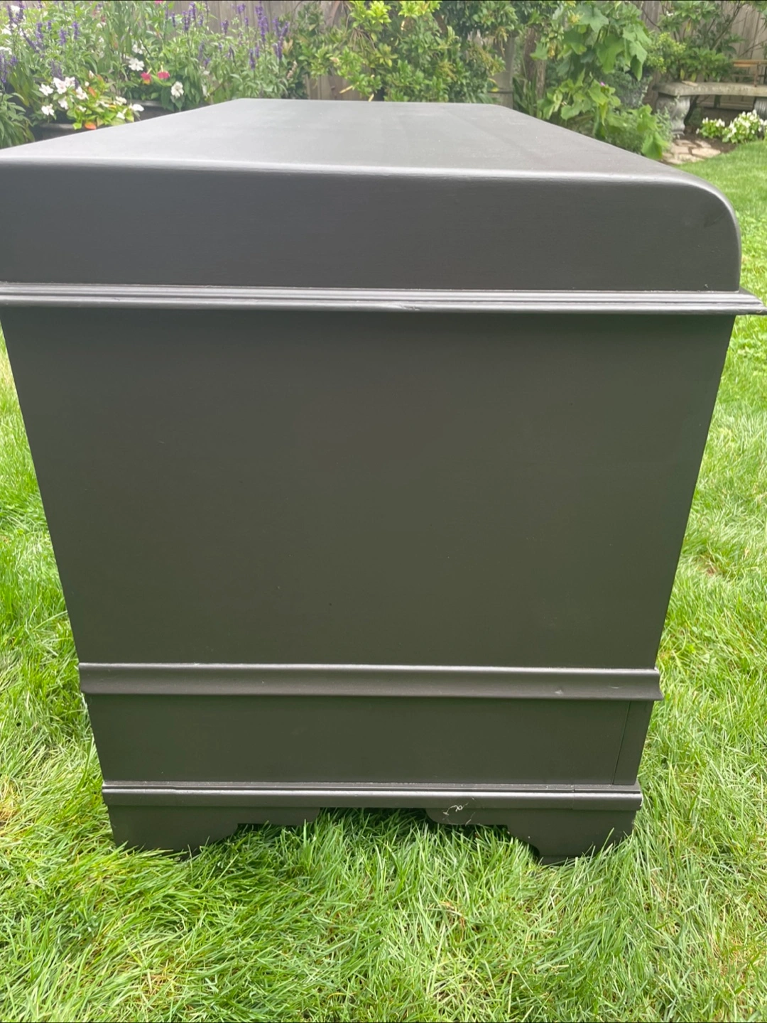 Excellent piece for storage. Would make a really nice bench too. Refinished in high end enamel “caviar” paint and “special walnut” stain. Measures 23.5 inches tall, 37 wide and 18 deep. Can deliver for a fee in reasonable distance with full payment.