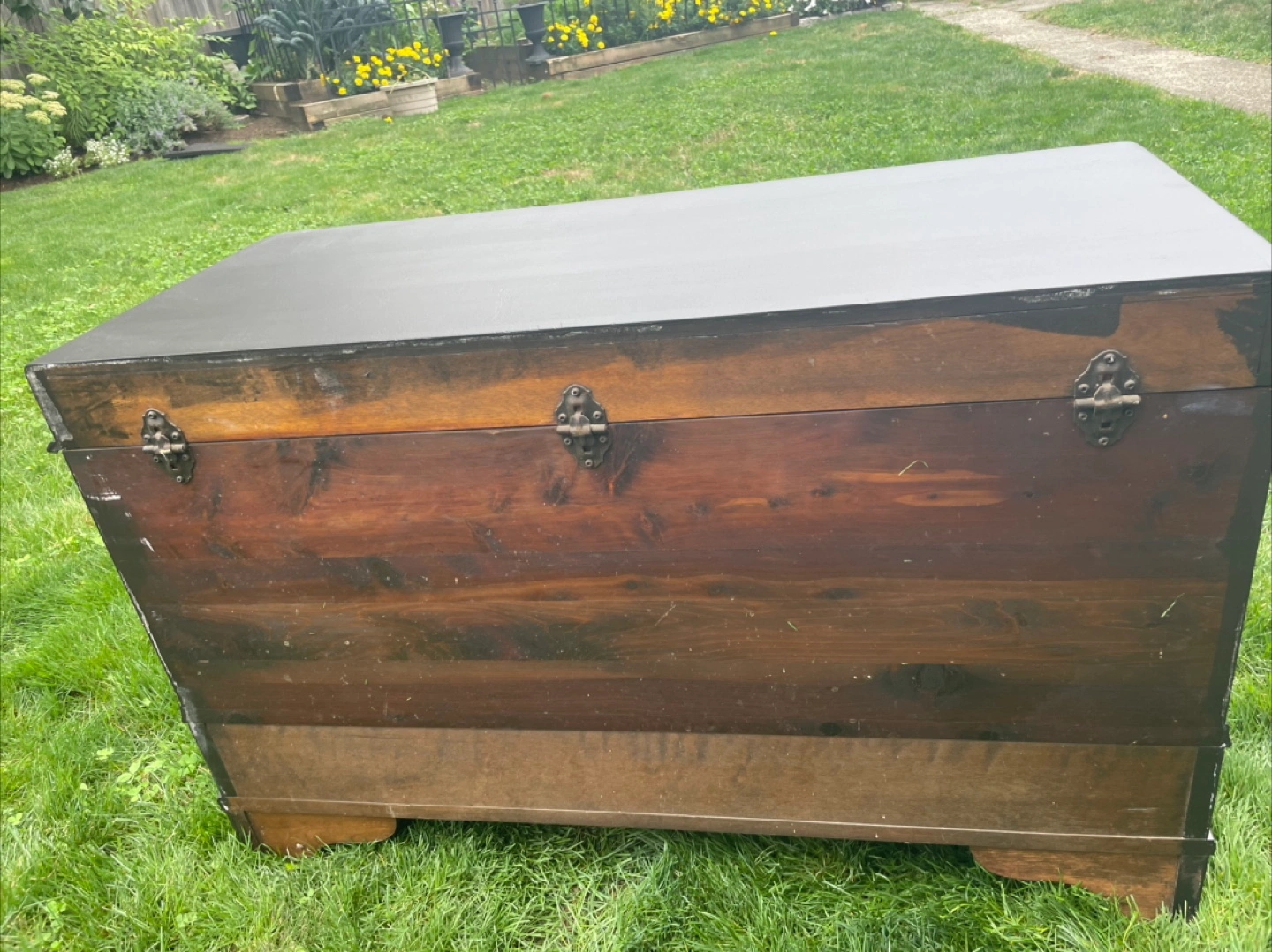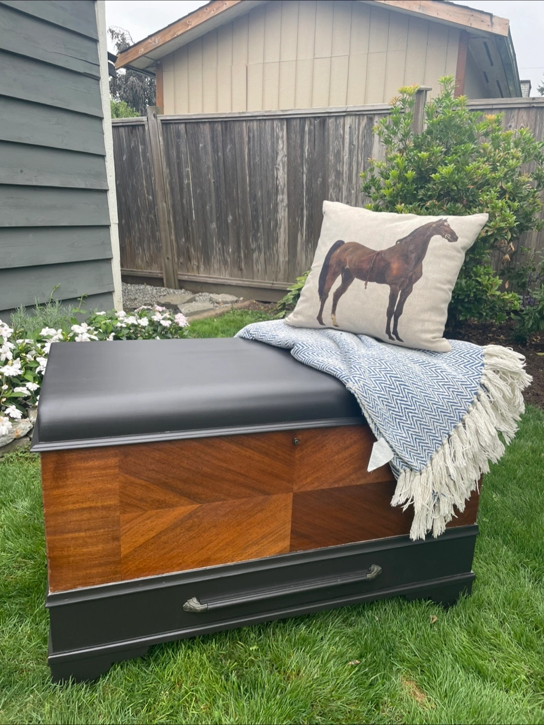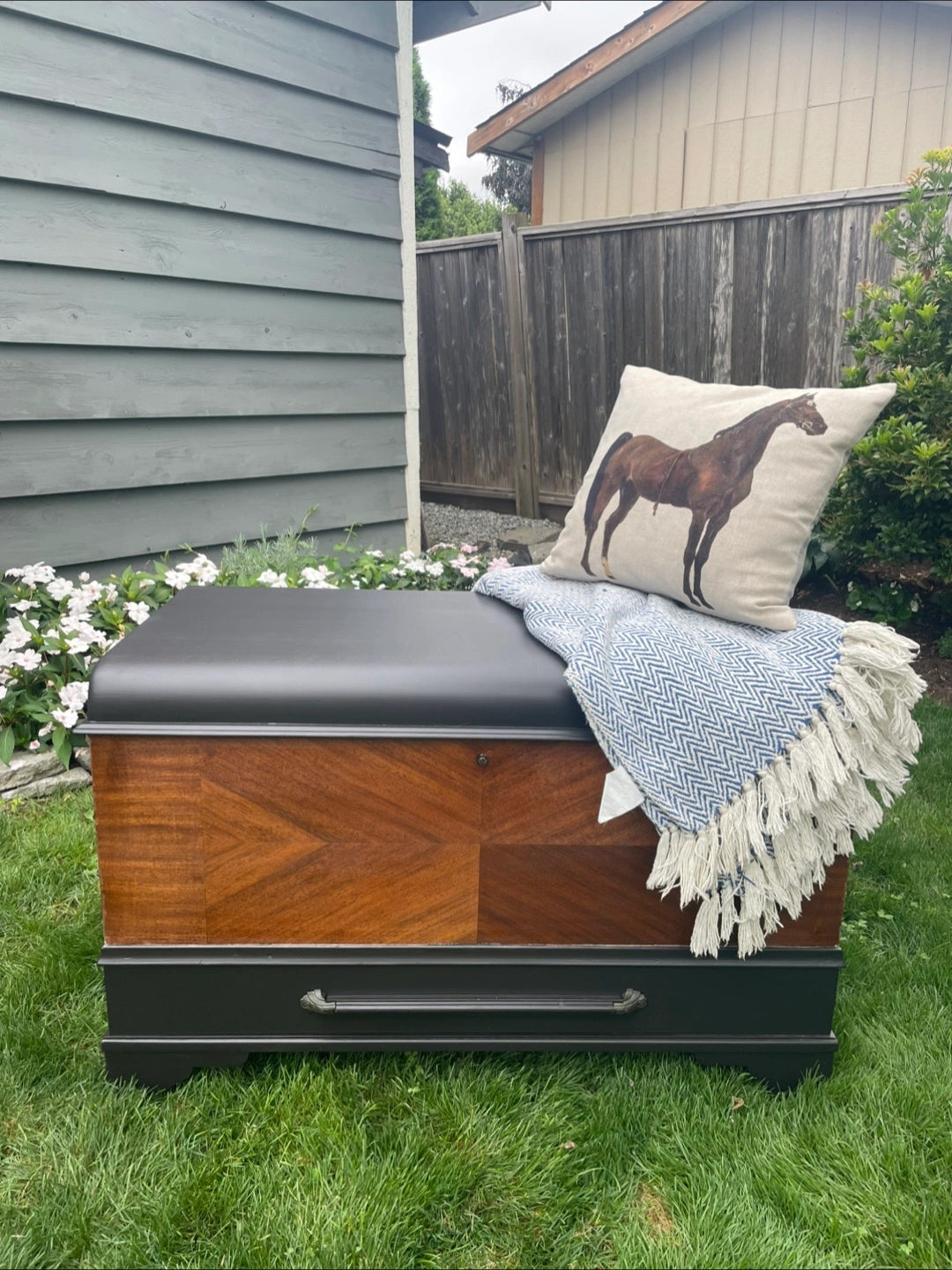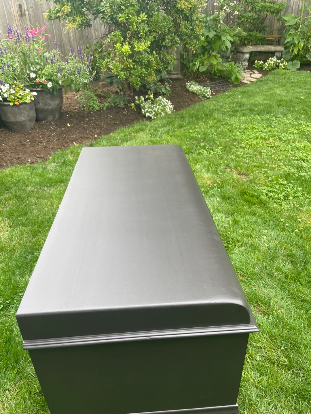 Excellent piece for storage. Would make a really nice bench too. Refinished in high end enamel “caviar” paint and “special walnut” stain. Measures 23.5 inches tall, 37 wide and 18 deep. Can deliver for a fee in reasonable distance with full payment.