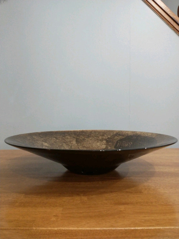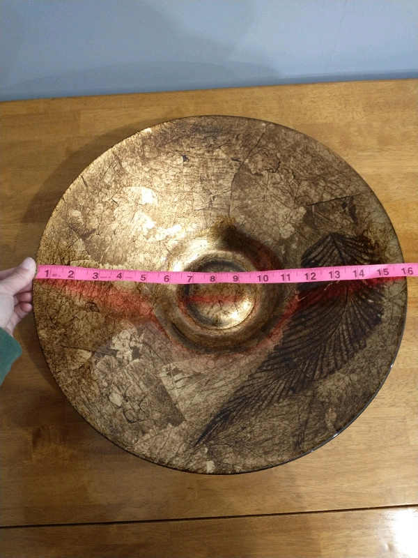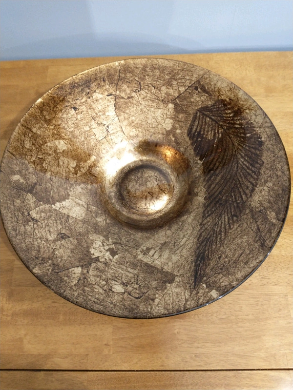 15Brownish-gold decorative bowl with leave accent 3 inches deep, 16 inches across