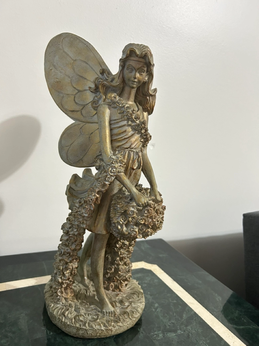 Set of two lovely fairy statue. Gold coloured finish. Intricate details. Wings and floral accents. Approximately 10 inches tall.$50 each