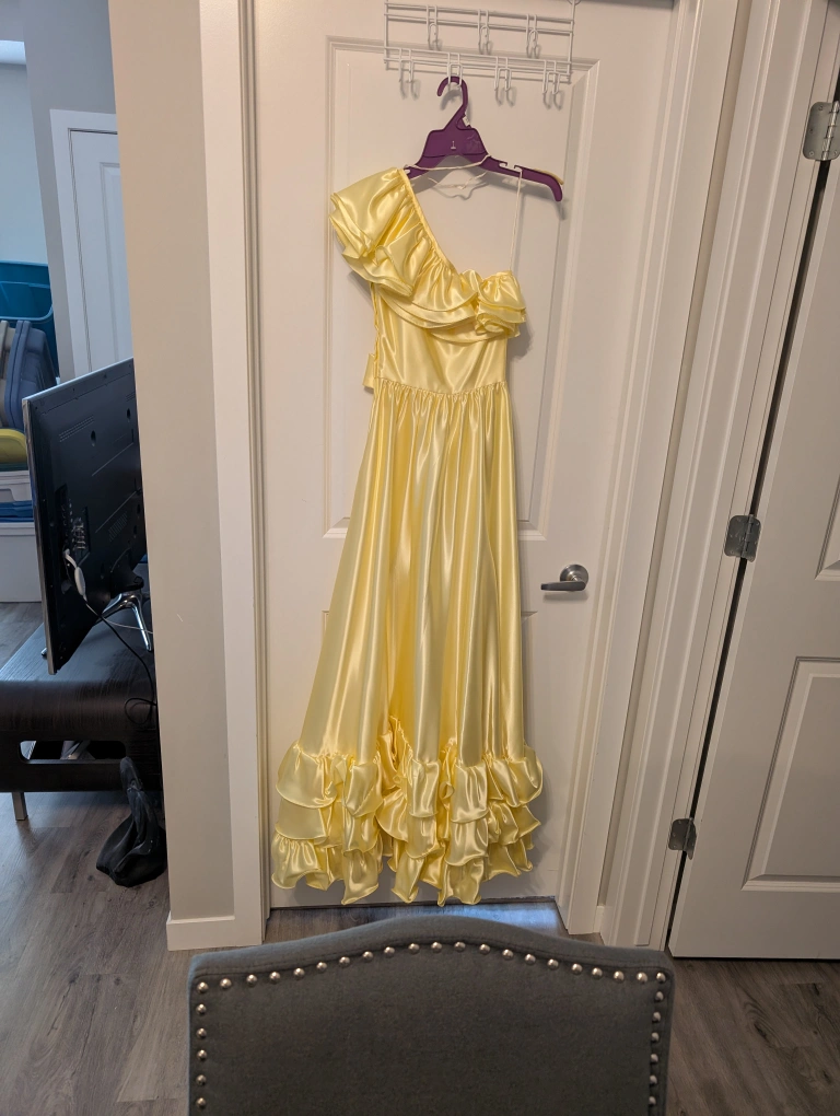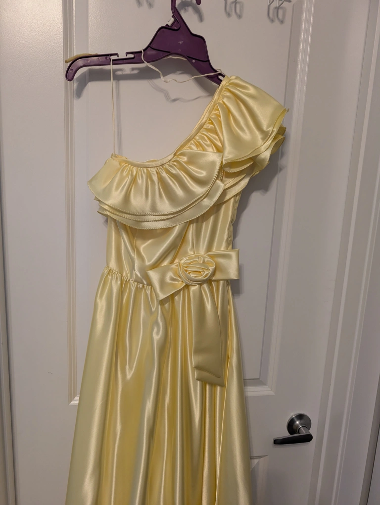 5Gorgeous pale yellow satin dress. One-shoulder design. Features ruffles and a satin bow. A-line silhouette. Looks great for a special occasion.