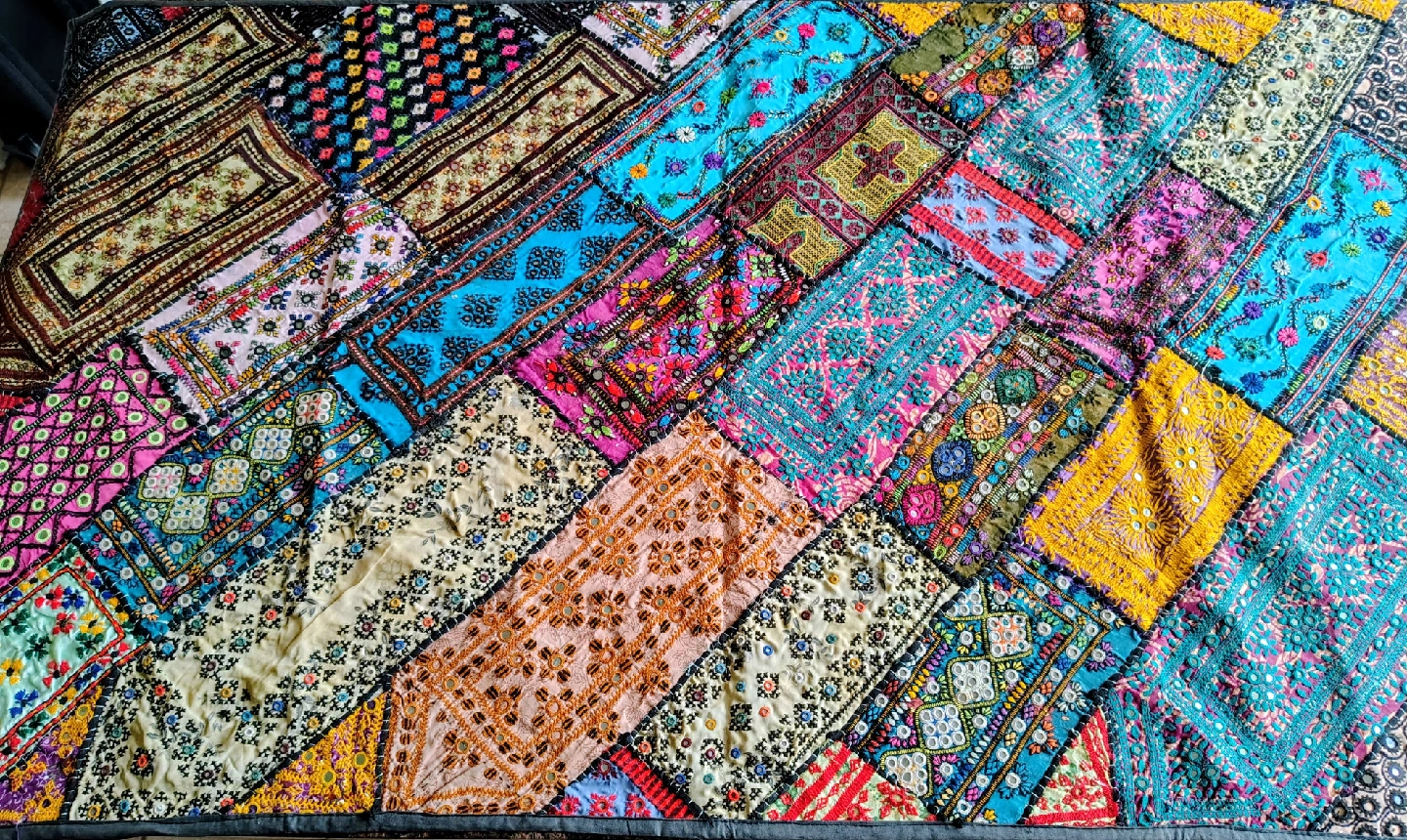 29Vibrant handmade patchwork wall hanging crafted from traditional embroidered fabrics. Each unique panel showcases intricate hand-stitched patterns, mirror work, and rich colors like turquoise, magenta, mustard, and ochre.