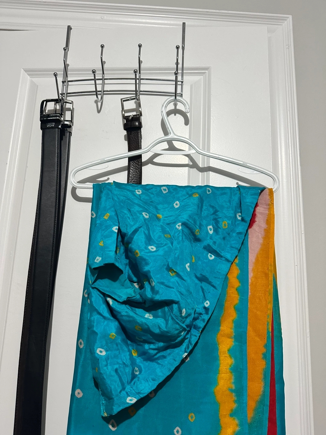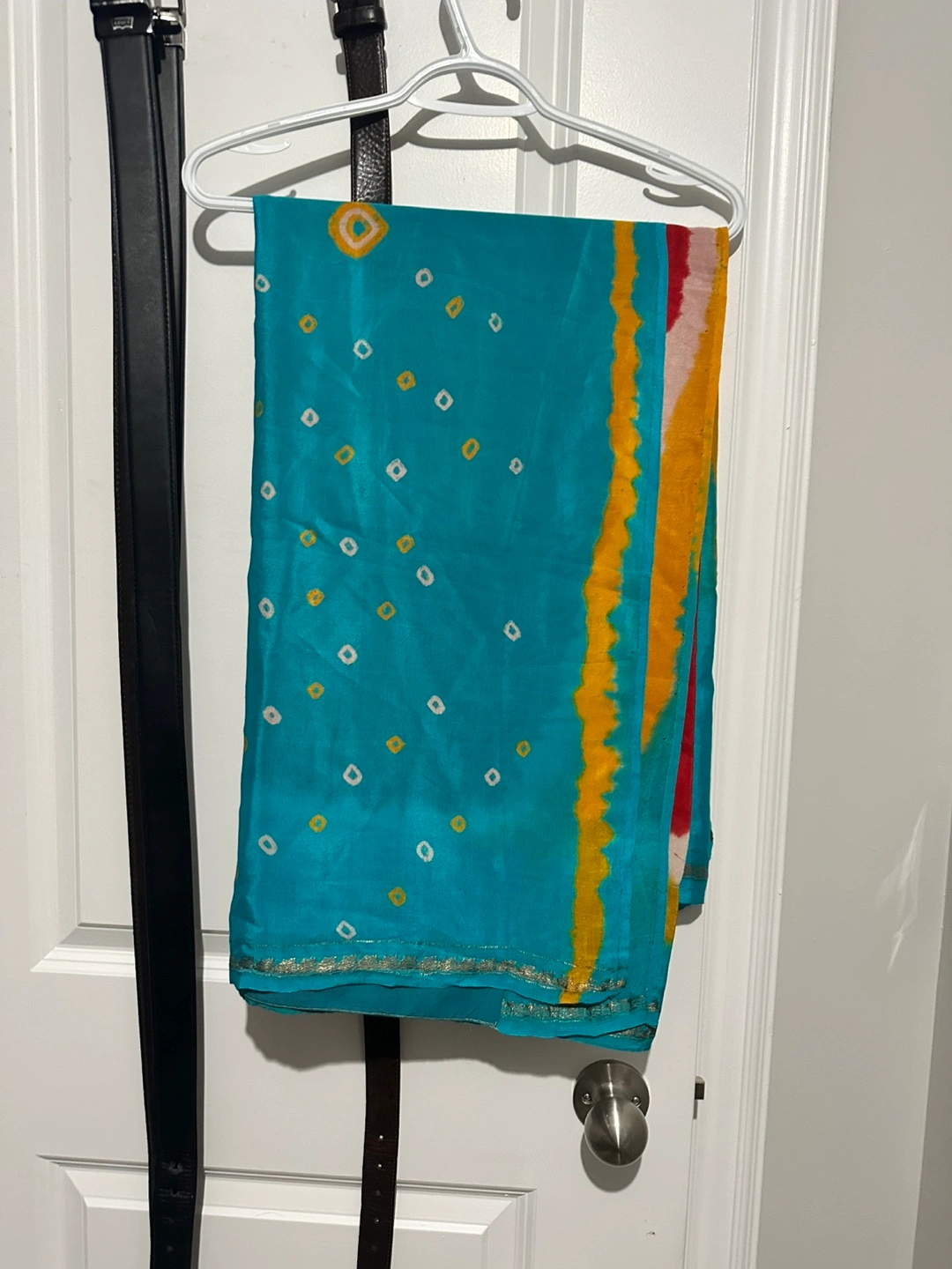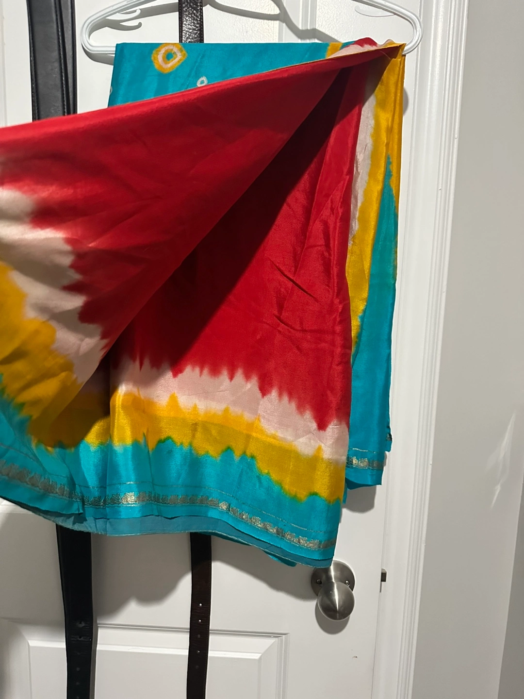 A vibrant sari in shades of blue and yellow with accents of red, gold and white. The sari has a border of gold, and a pattern of white and yellow dots. You can wear this sari to any special occasion and feel your best.