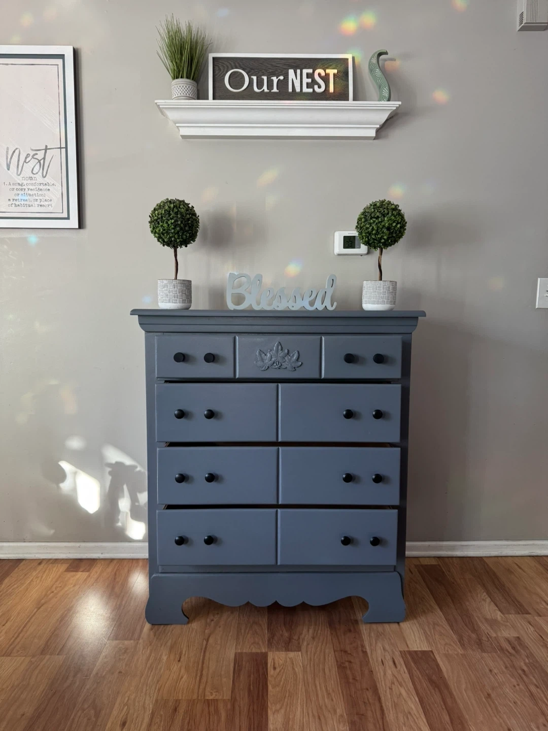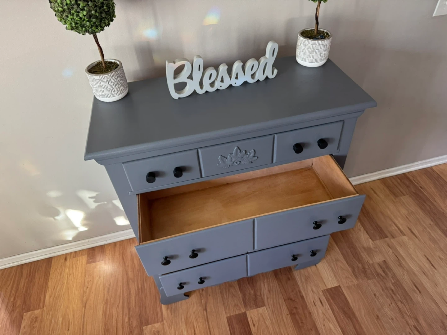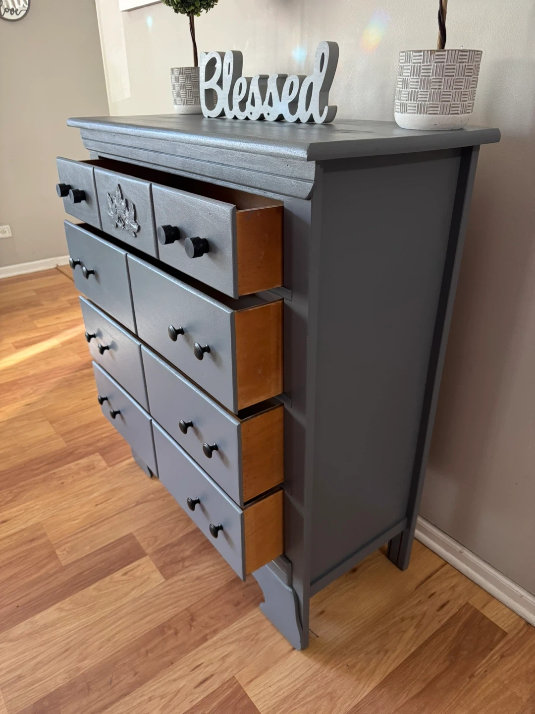 Press “See more” to read full description‼️ ✨Beautiful gray (can look bluish in bright light) solid refinished older dresser/Chest of drawers, Krest Colonial furniture💪🏼, all 4 drawers pull out fine on tracks, black hardware, solid piece💪🏼, Clean & sturdy! This is NOT that cheap wayfair/Ikea furniture, this will last you FOREVERR, I sell good quality furniture & my prices are still better/cheaper than a furniture store. Please don’t ask to lower my price‼️ Measurements; 42 inches tall 37 inches wide 16 inches deep FAST & EASY DRIVEWAY PICKUP IN LOCKPORT✅ BRING HELP IF YOU HAVE IT💪🏼OR WE CAN ASSIST HELP‼️aDELIVERY AVAILABLE🚚, $60 DEPOSIT REQUIRED‼️ CASH ONLY‼️ BRING EXACT CHANGE PLEASE OR $50 DEPOSIT WITH ZELLE & ITS COMPLETELY YOURS‼️ (DECOR NOT INCLUDED)‼️ CHECKOUT MY OTHER LISTINGS 😁 ✨Feel free to follow me for more upcoming furniture & I definitely appreciate you for following me! 🤝✨