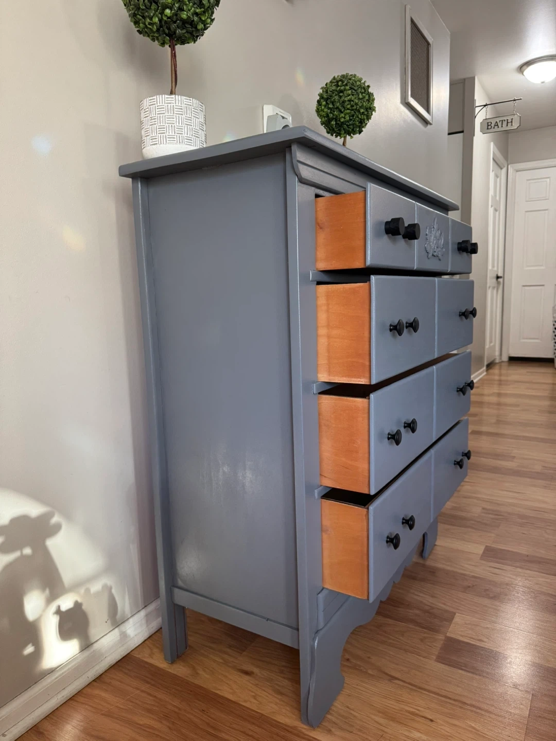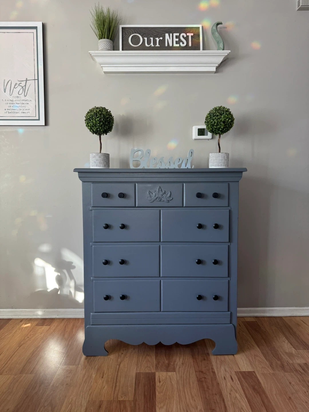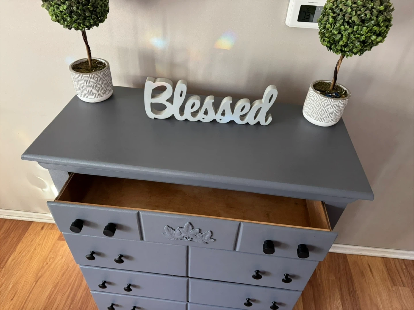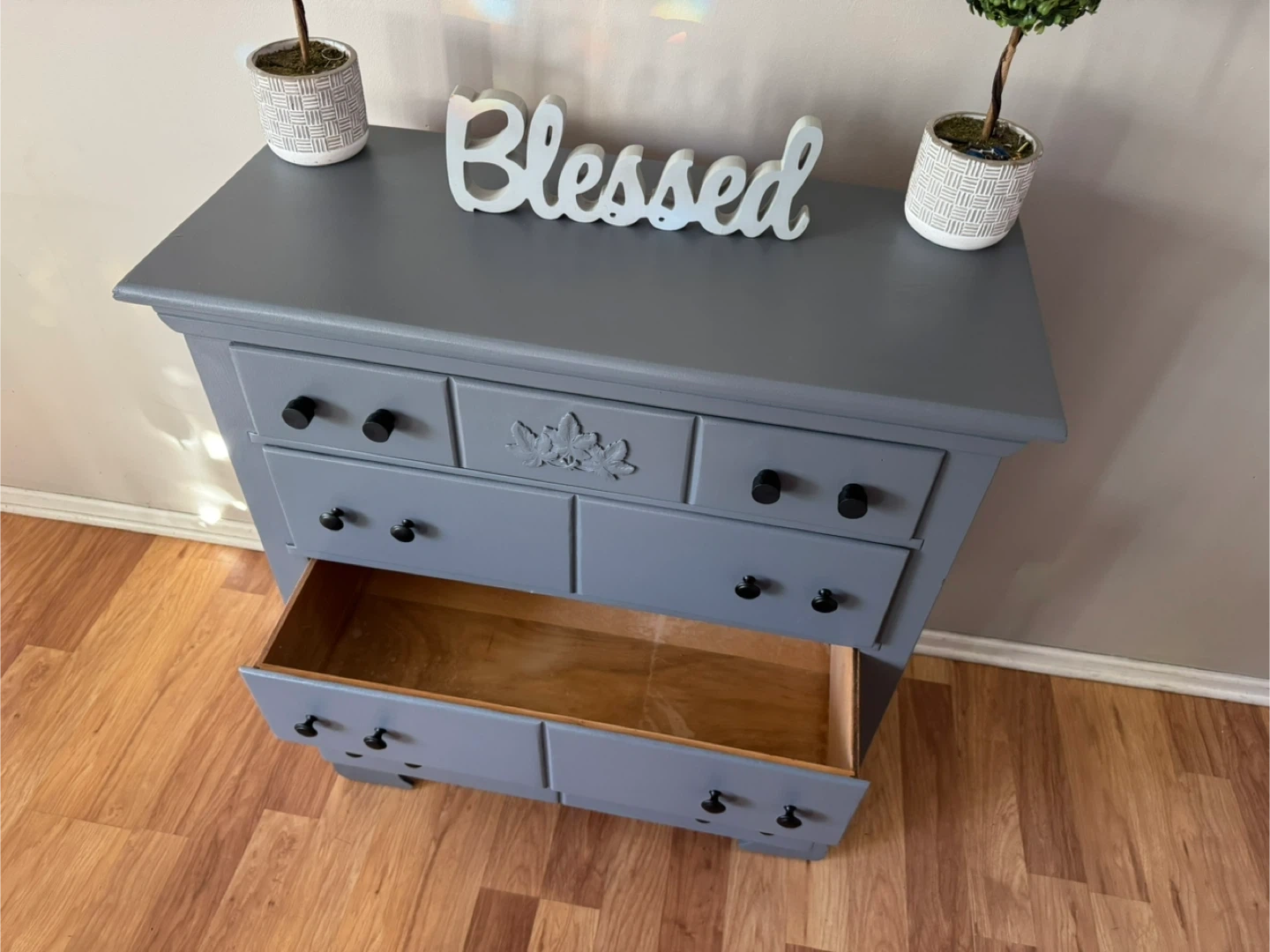 Press “See more” to read full description‼️ ✨Beautiful gray (can look bluish in bright light) solid refinished older dresser/Chest of drawers, Krest Colonial furniture💪🏼, all 4 drawers pull out fine on tracks, black hardware, solid piece💪🏼, Clean & sturdy! This is NOT that cheap wayfair/Ikea furniture, this will last you FOREVERR, I sell good quality furniture & my prices are still better/cheaper than a furniture store. Please don’t ask to lower my price‼️ Measurements; 42 inches tall 37 inches wide 16 inches deep FAST & EASY DRIVEWAY PICKUP IN LOCKPORT✅ BRING HELP IF YOU HAVE IT💪🏼OR WE CAN ASSIST HELP‼️aDELIVERY AVAILABLE🚚, $60 DEPOSIT REQUIRED‼️ CASH ONLY‼️ BRING EXACT CHANGE PLEASE OR $50 DEPOSIT WITH ZELLE & ITS COMPLETELY YOURS‼️ (DECOR NOT INCLUDED)‼️ CHECKOUT MY OTHER LISTINGS 😁 ✨Feel free to follow me for more upcoming furniture & I definitely appreciate you for following me! 🤝✨