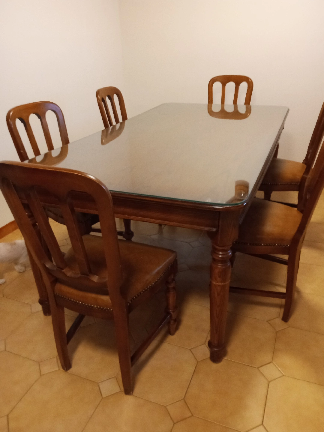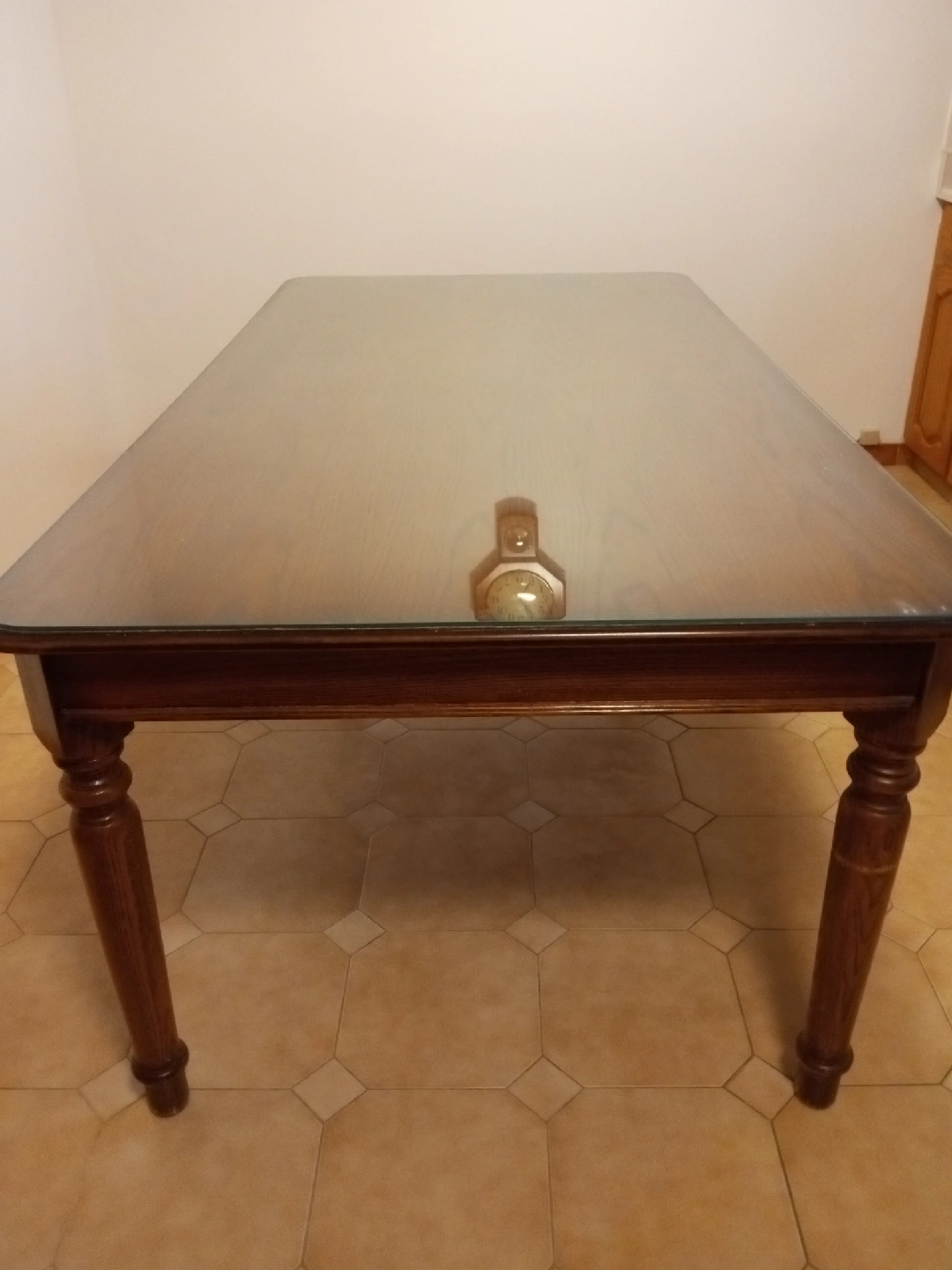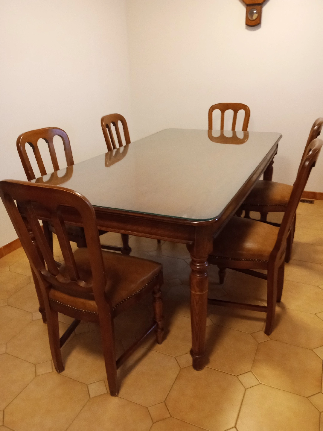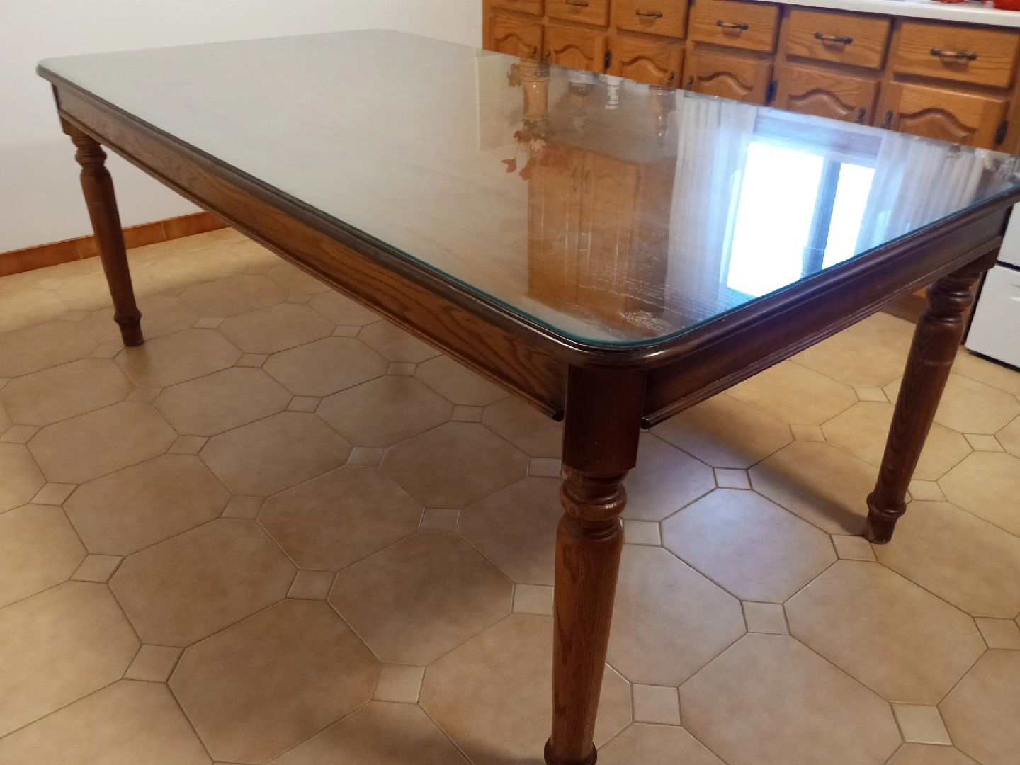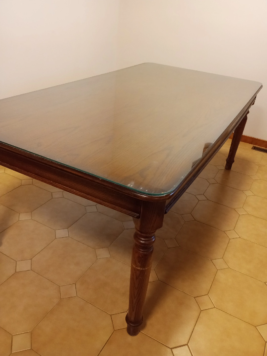 49Solid oak kitchen table, dark wood. Table has glass top, can be removed and refinished. Table has some use and scratches that can be easily refinished. Seats 6 to 8 . There are 6 chairs included, solid wood however they do require some work to clear the scratches. Size is a little over 6.5 feet by 3.5 feet. Requires disassembling , bring tools and an extra hand as table is very heavy.