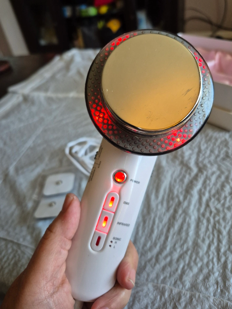 This beauty device has multiple functions, including massage, tapping, scraping, and slimming. It features EMS, infrared, and sonic modes for a variety of treatments. Comes with accessories and the original box 647 278 2395