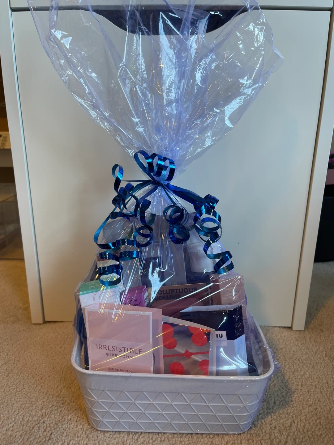A cute gift basket filled with various beauty products! Includes brands like Givenchy and Too Faced - Kloraine eye makeup remover - Pur Cosmetics eyelashes - Pur cosmetics Lippy - Too Faced Mascara - Maybelline Lip gloss - Nyx Butter Melt bronzer - fragrance samples Retail values at $85+