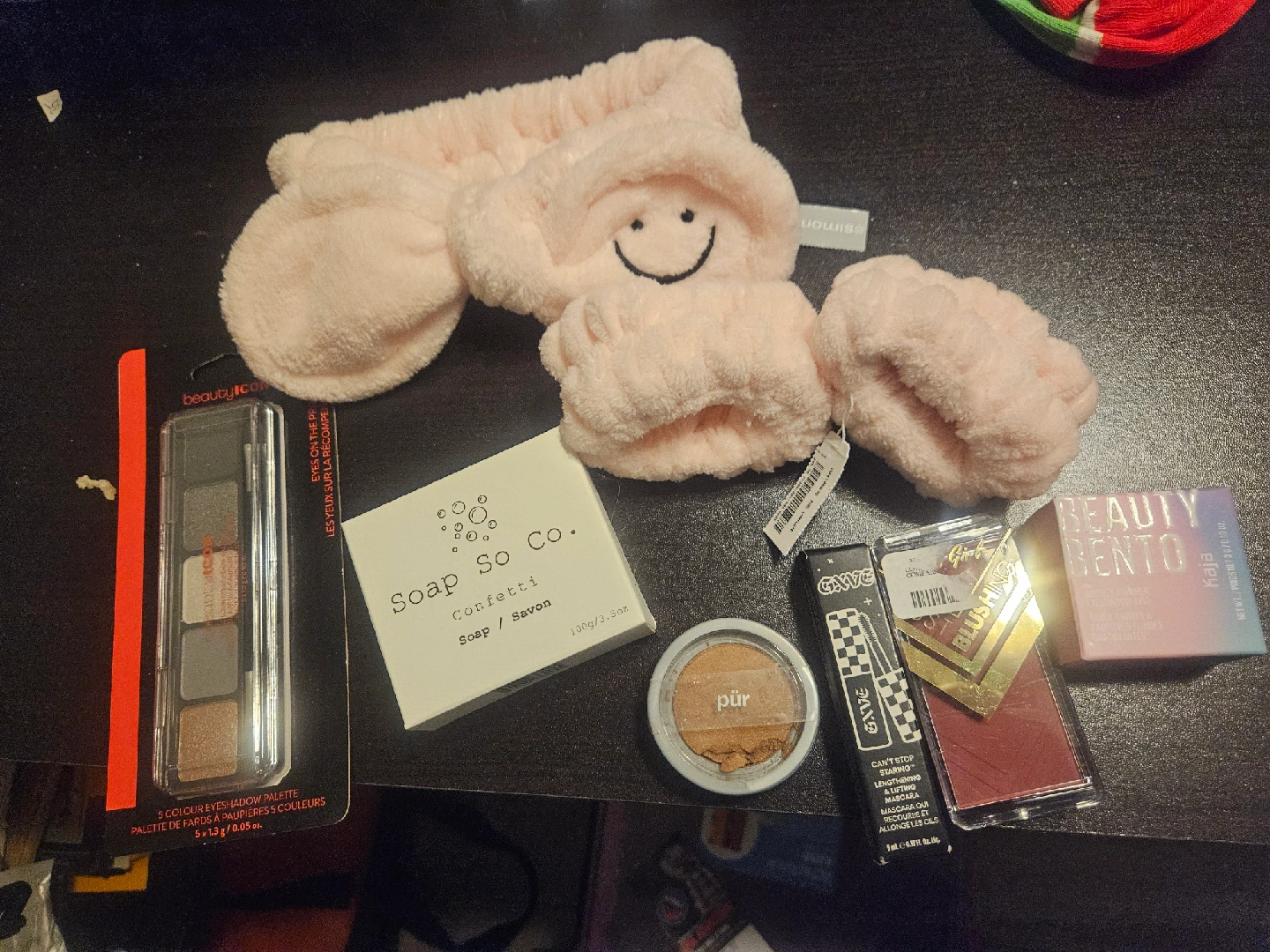 72Selling a bundle of beauty items! Includes a super cute Simon headband, a Beauty Icon eyeshadow palette, Soap So Co. Confetti soap, a Pür item, a GXVE lengthening mascara, and a Kaja Beauty Bento blush