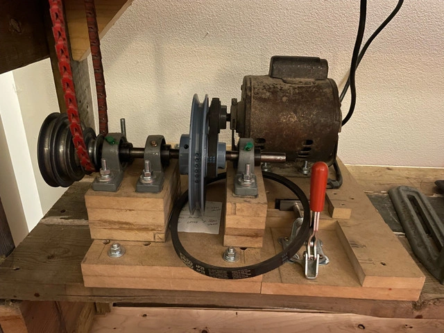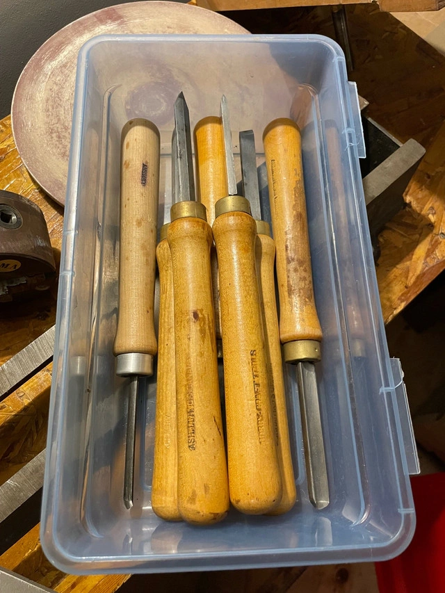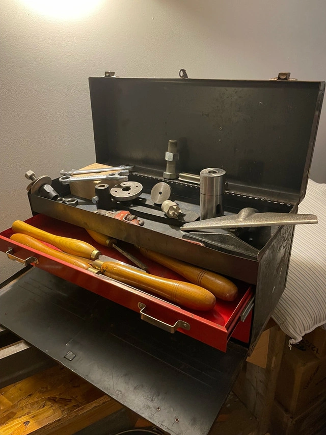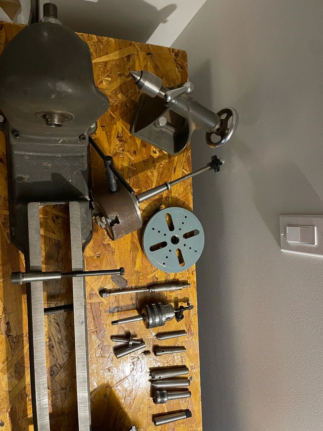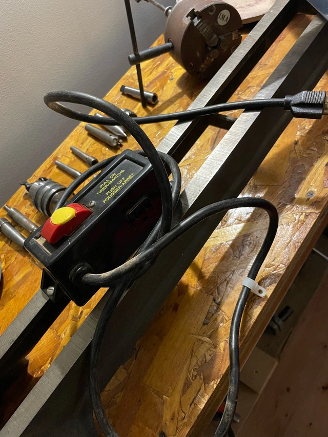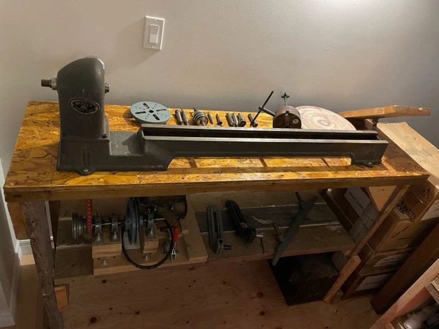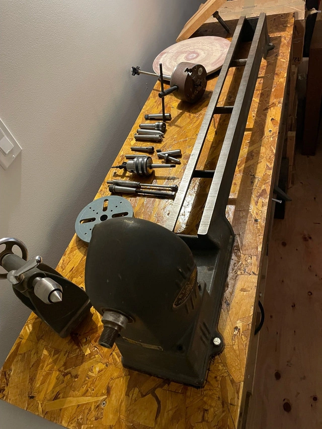 Beaver Model 3400 36" wood lathe. Has spindle with MT1 and MT2 compatibility. Has jack leg pulley system to add additional or variable speeds. Bench is super solid 61" long x 18" wide x 36.5" tall. Comes with everything you see: Wine stopper mandrel 3 jaw chuck 12" sanding disc Turnkey - great little lathe that was made in Guelph, ONT