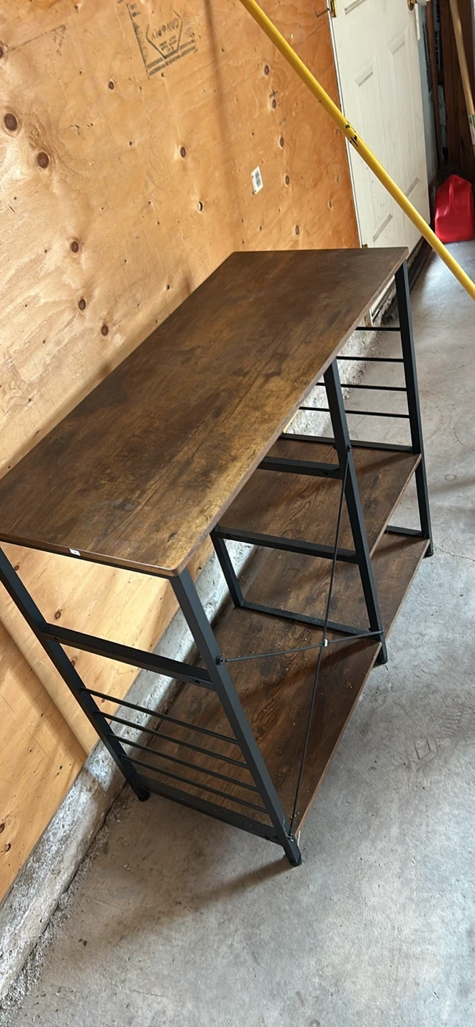 This rustic desk features a durable wood top and two built-in shelves. Its metal frame offers sturdy support. Great for small spaces or as a beginner desk!