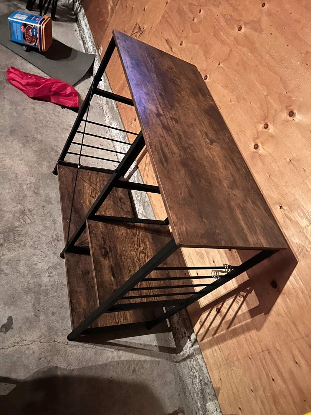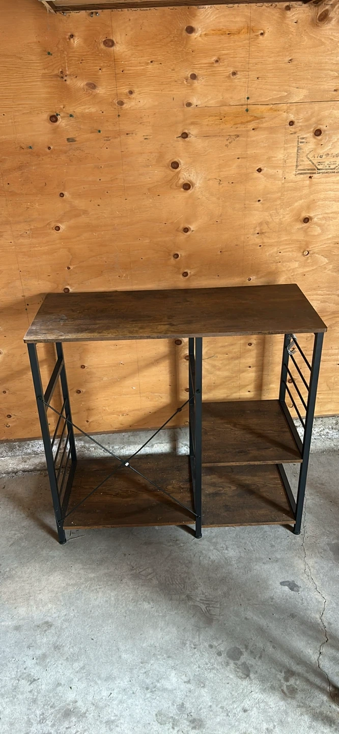 This rustic desk features a durable wood top and two built-in shelves. Its metal frame offers sturdy support. Great for small spaces or as a beginner desk!