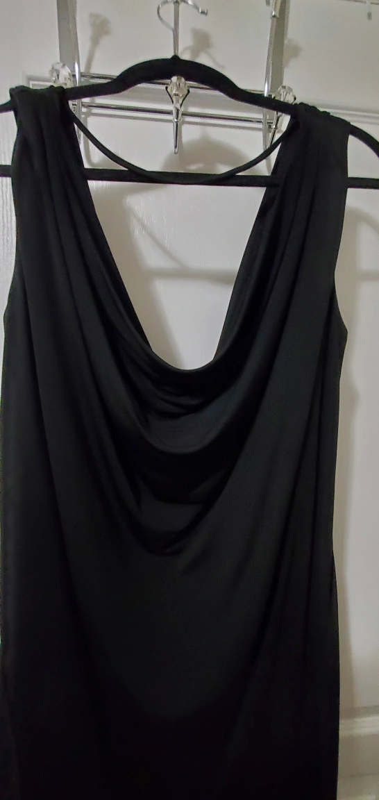Never worn. Has a flattering drape neckline. Can wear with belt. Perfect for a night out or a special occasion!