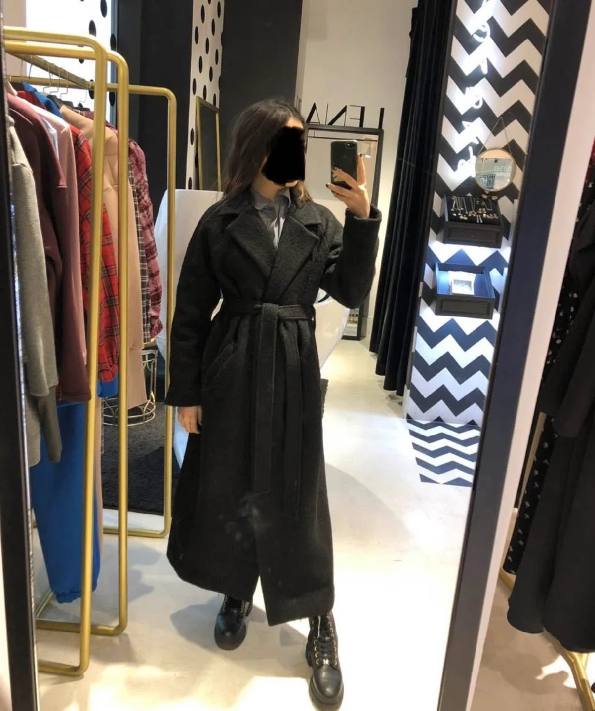 This long black coat is made from a wool blend for warmth and style. It features a classic notched lapel and a tie belt to cinch the waist. Perfect for layering over any outfit this season!