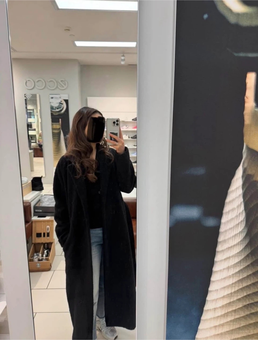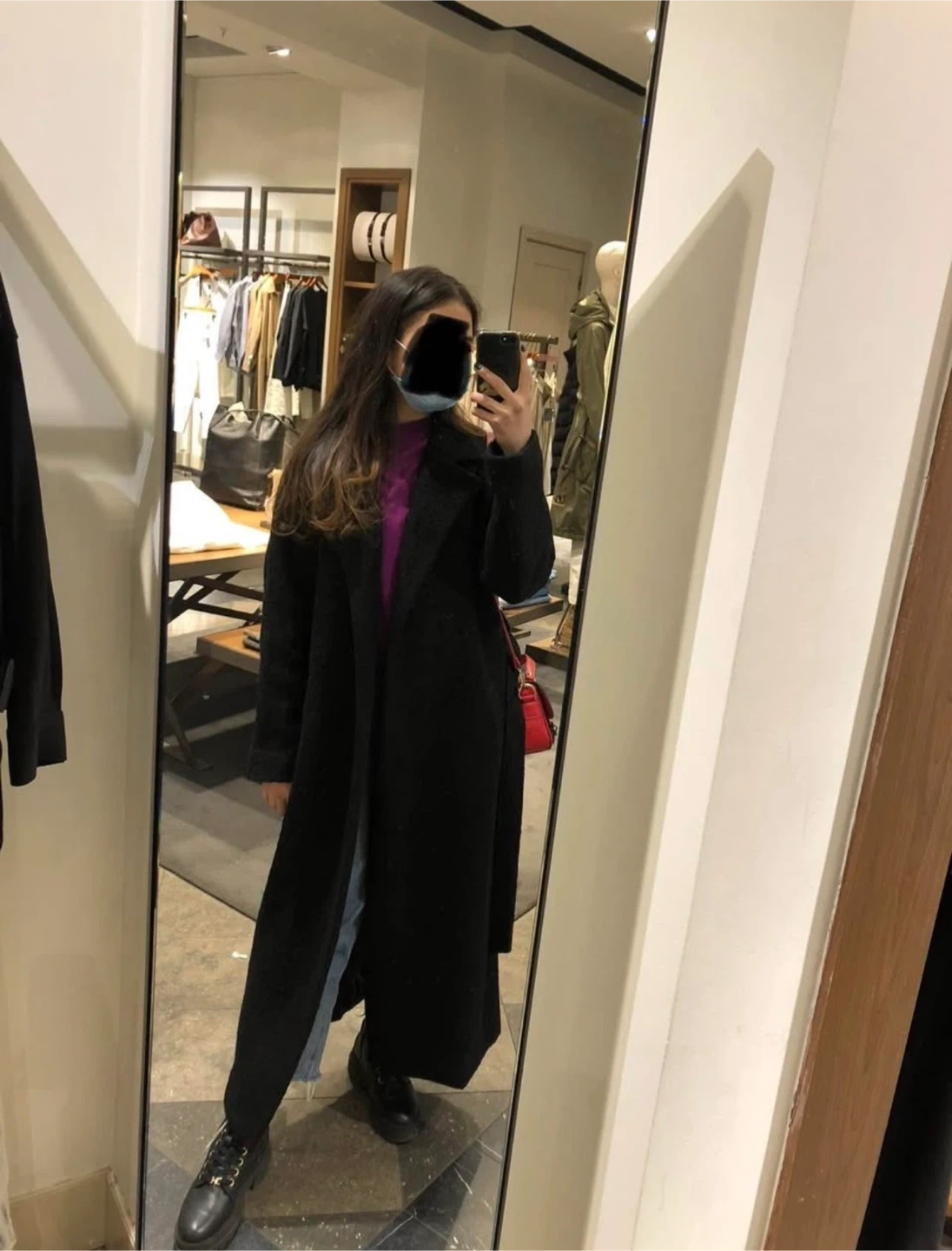 This long black coat is made from a wool blend for warmth and style. It features a classic notched lapel and a tie belt to cinch the waist. Perfect for layering over any outfit this season!