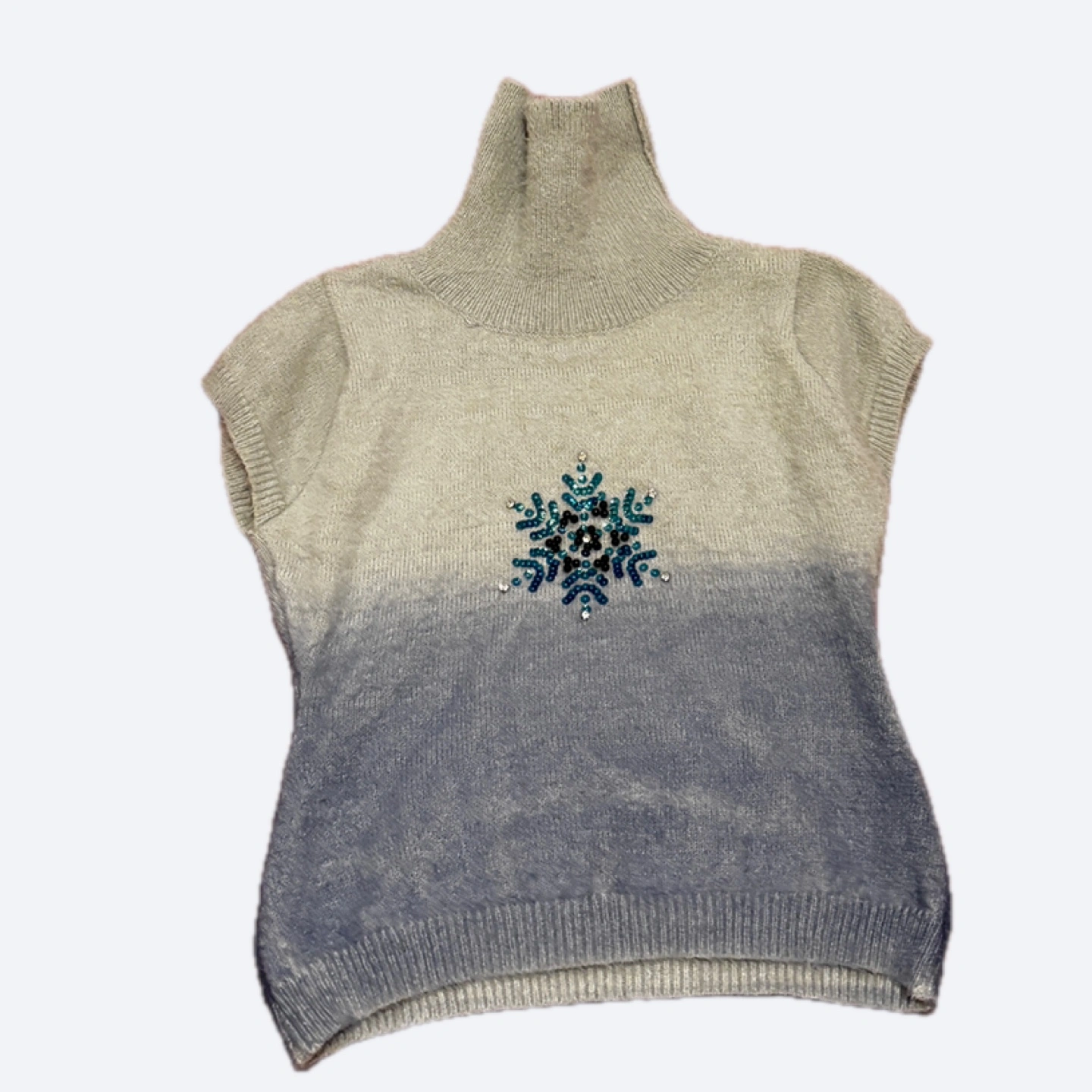 Here's a lovely grey turtleneck sleeveless sweater! It features a cute snowflake design on the front. Perfect for layering or wearing on its own during cooler days