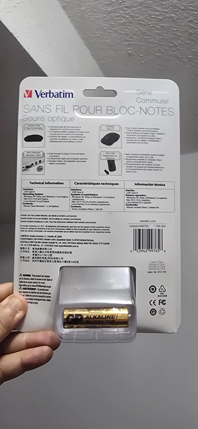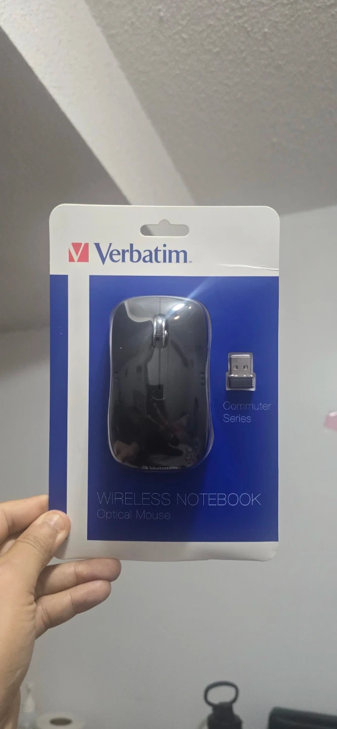 Verbatim wireless notebook optical mouse in original packaging. Includes 1 AA alkaline battery. Compact design, works with Windows 7 and higher, Mac OS X.