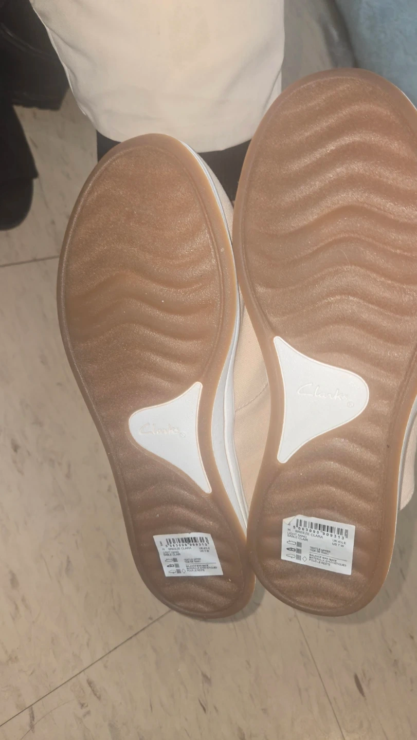 These Clarks Cloudsteppers mules are a light tan colour. They feature a slip-on design with decorative laces. The soles offer comfortable cushioning don't fit me