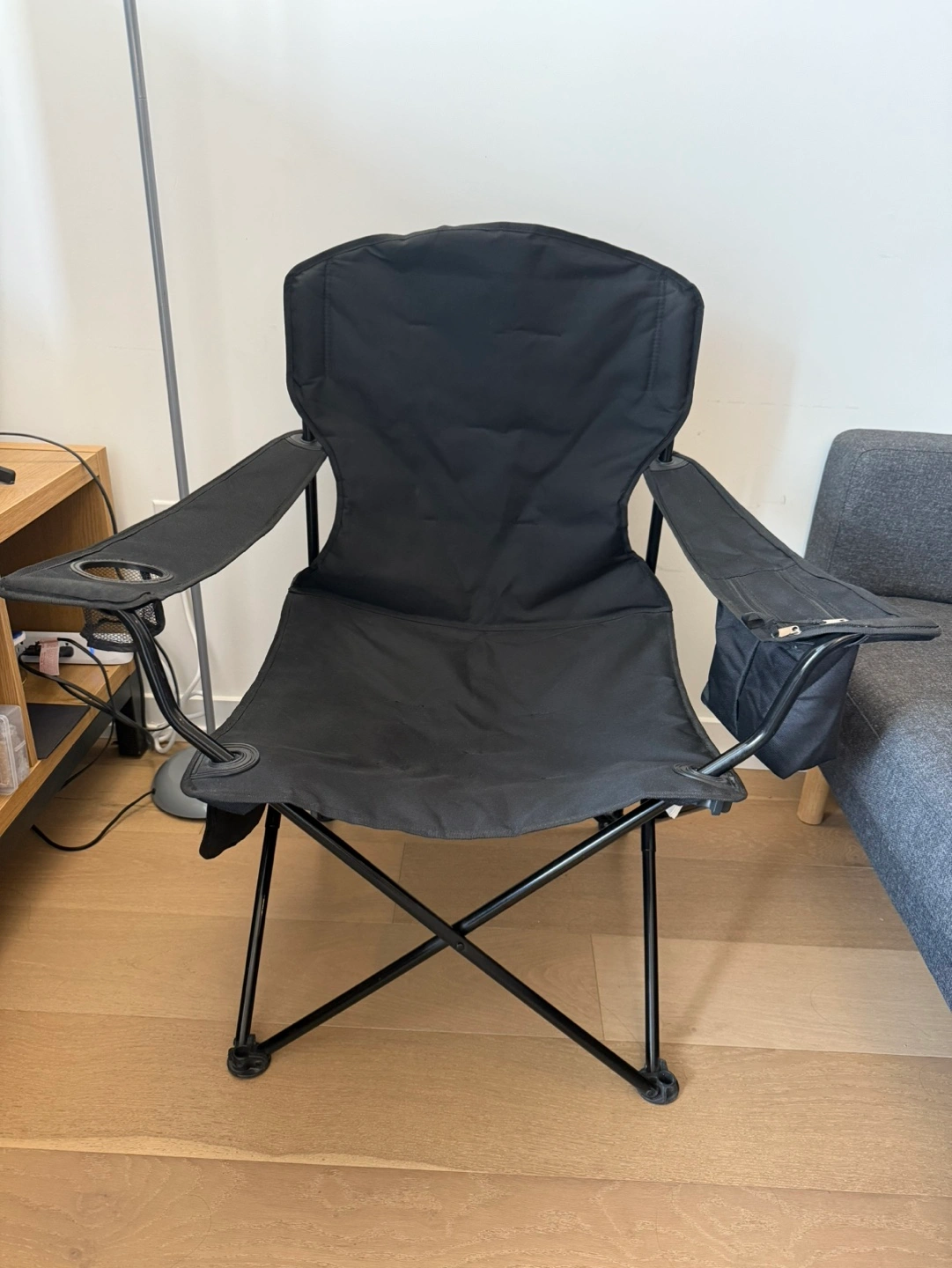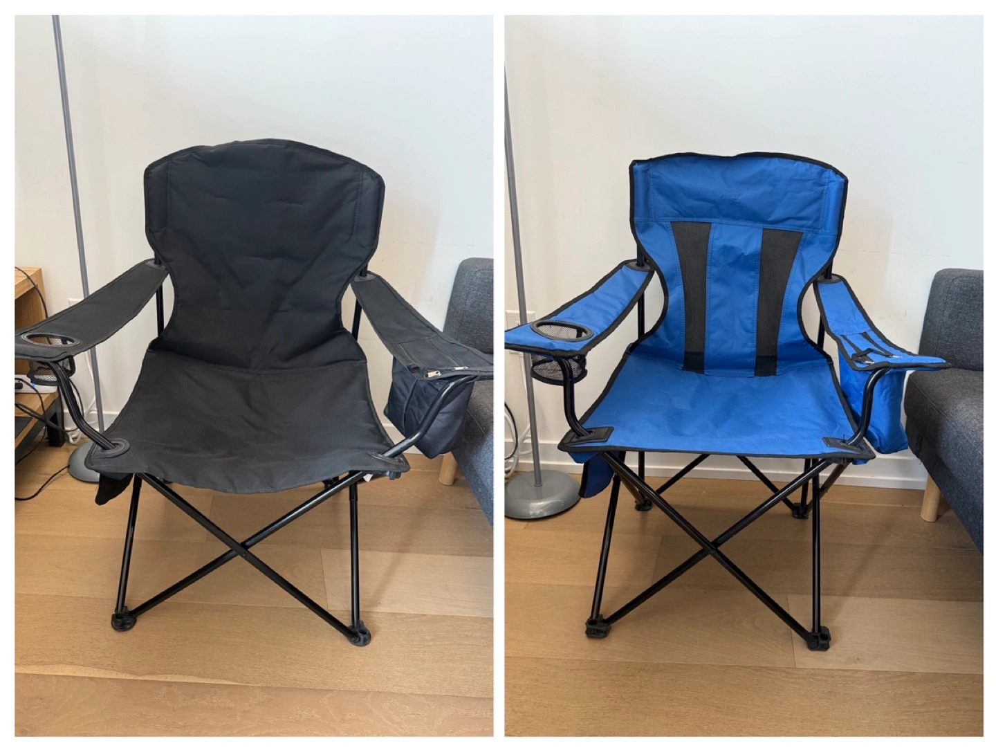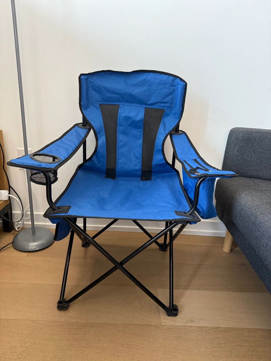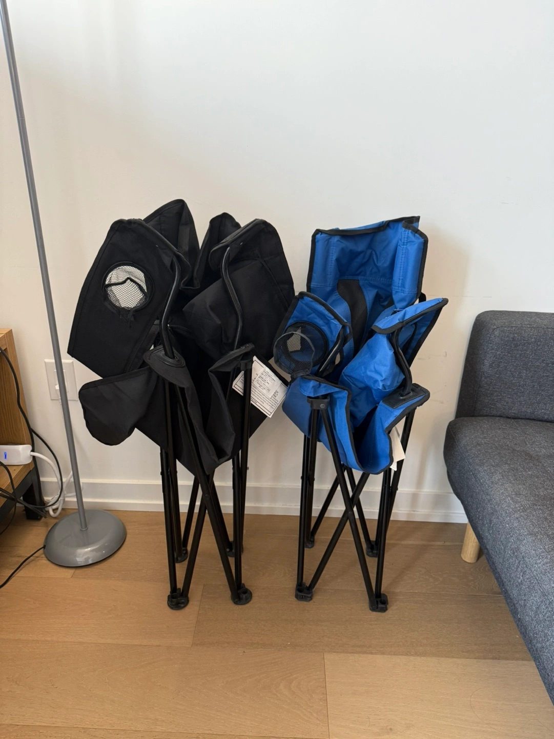 Two portable folding camping chairs. One black, one blue. Cup holders on each armrest. Metal frame. Easy to fold and store.
