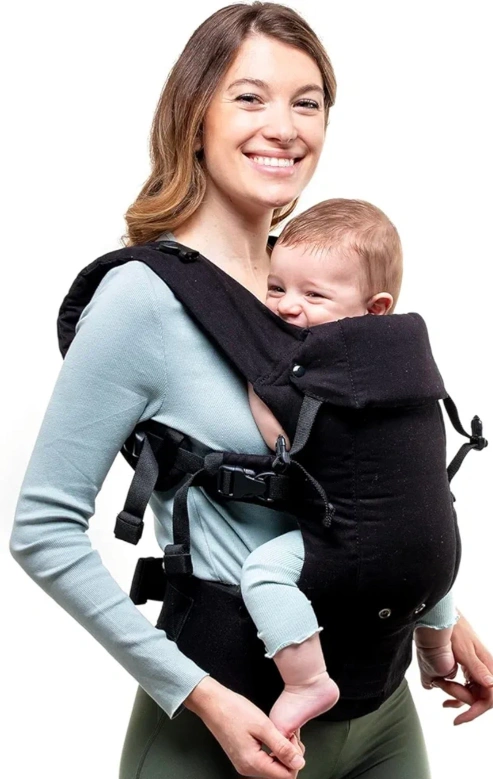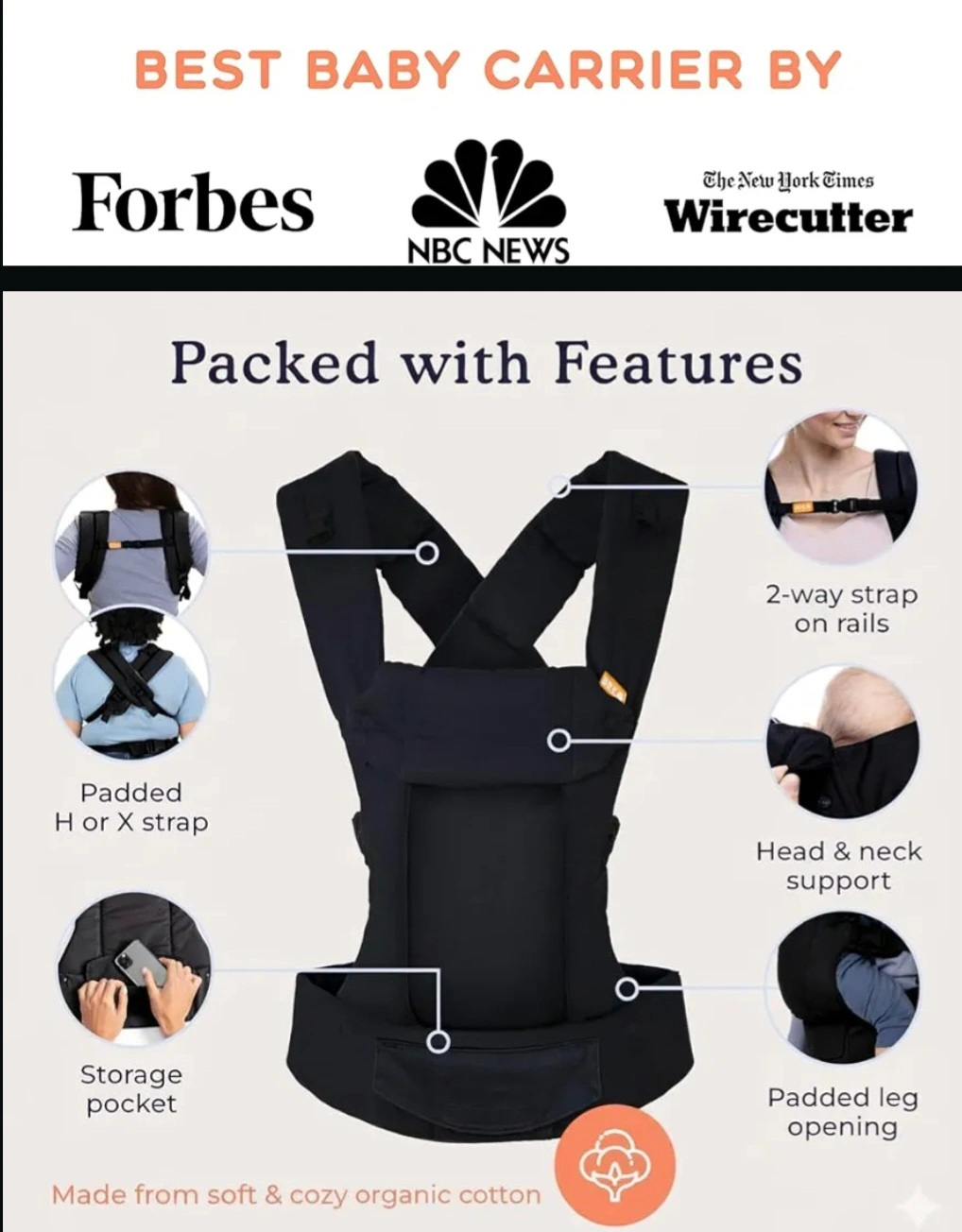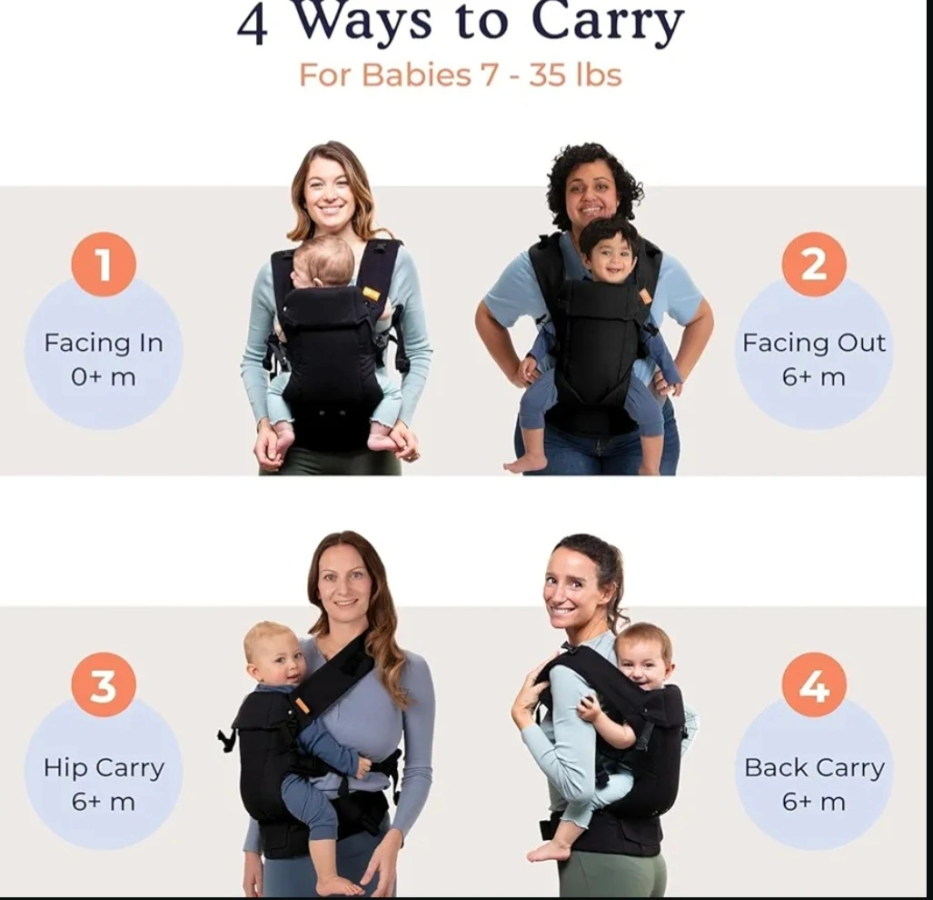 Beco Gemini Baby Carriers from Newborn to Toddler - Certified Ergonomic Newborn Baby Carrier for Infants and Children of 7-35 lbs - Porte Bébé M Shape, Adjustable Seat, 100% Cotton (Organic Black) - Padded H or X strap - 2-way strap on rails - Head & neck support - Storage pocket - Padded leg opening It can carry babies from 7-35 lbs and has 4 ways to carry: Facing In (0+ m), Facing Out (6+ m), Hip Carry (6+ m), and Back Carry (6+ m) -Open Box, New