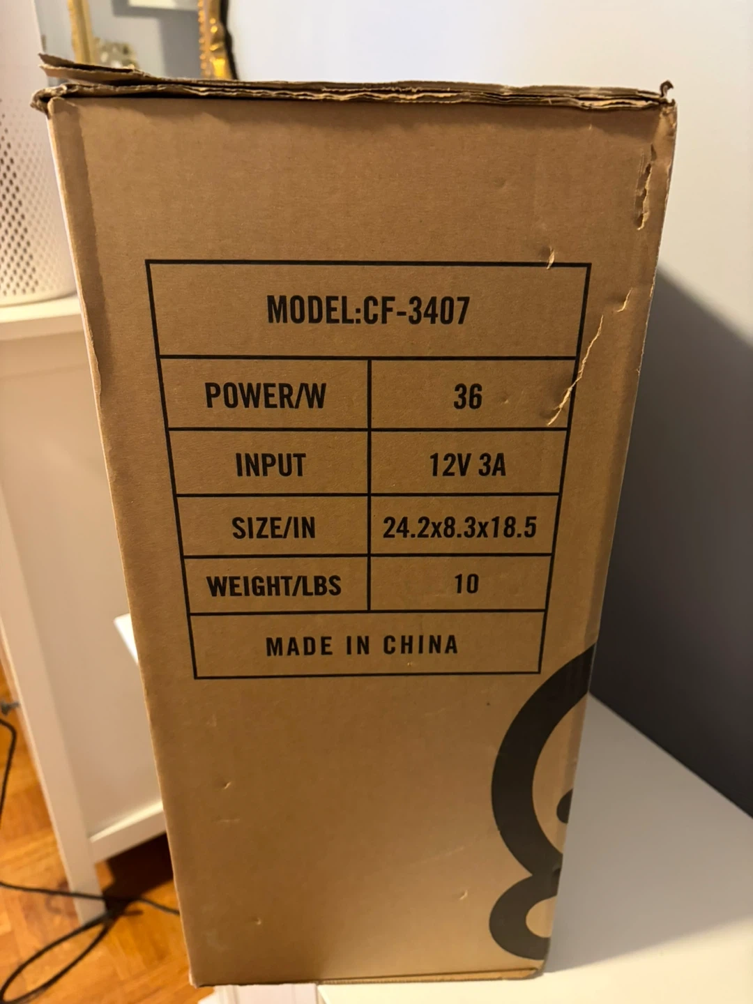 This is a COMFIER CF-3407 heated massage mat. It has a power of 36W and uses a 12V 3A input. The dimensions are 24.2x8.3x18.5 inches and it weighs 10 lbs.