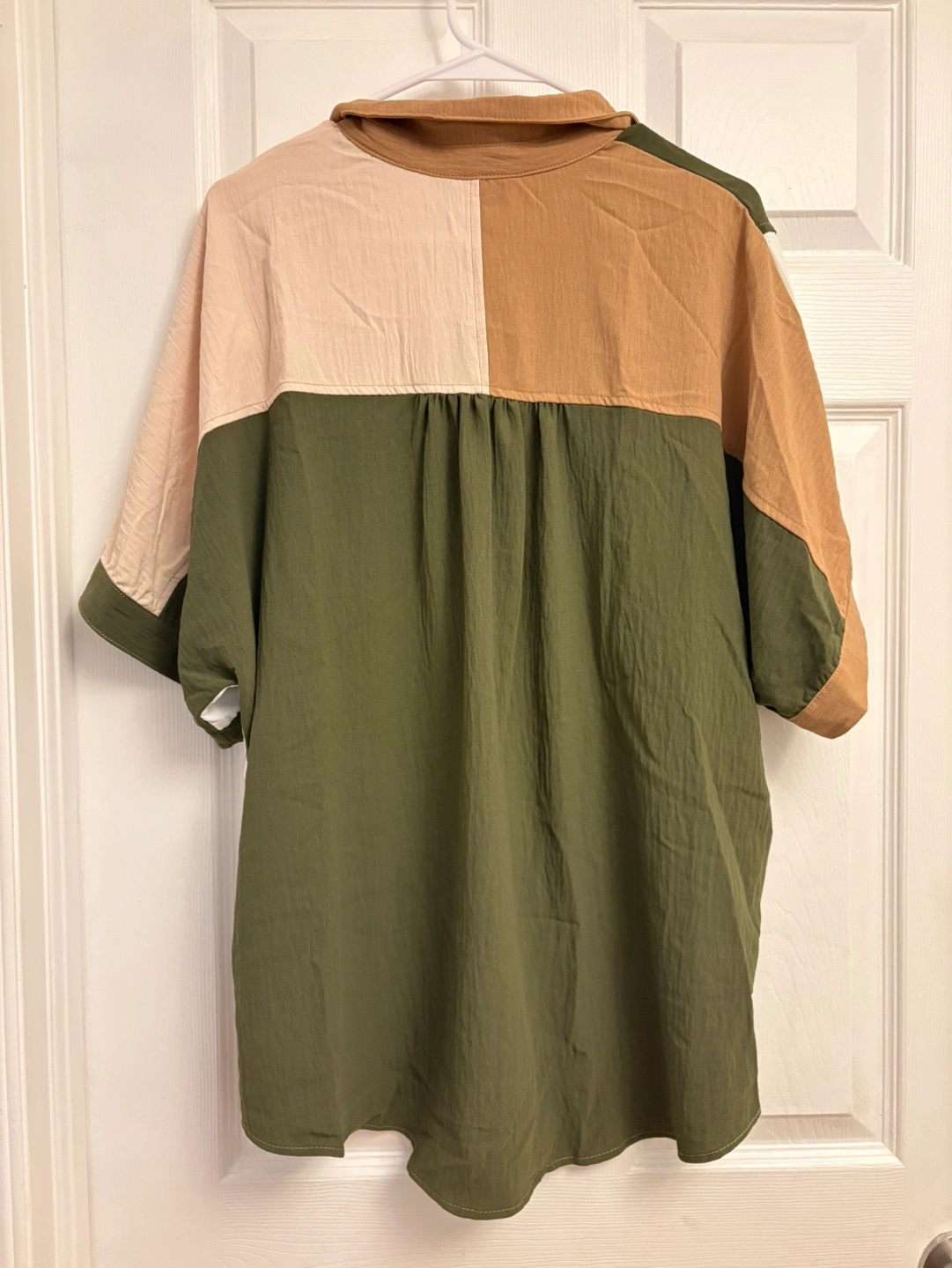 Short sleeve collared button-down shirt. Features a colour block design in olive green, beige and off-white.