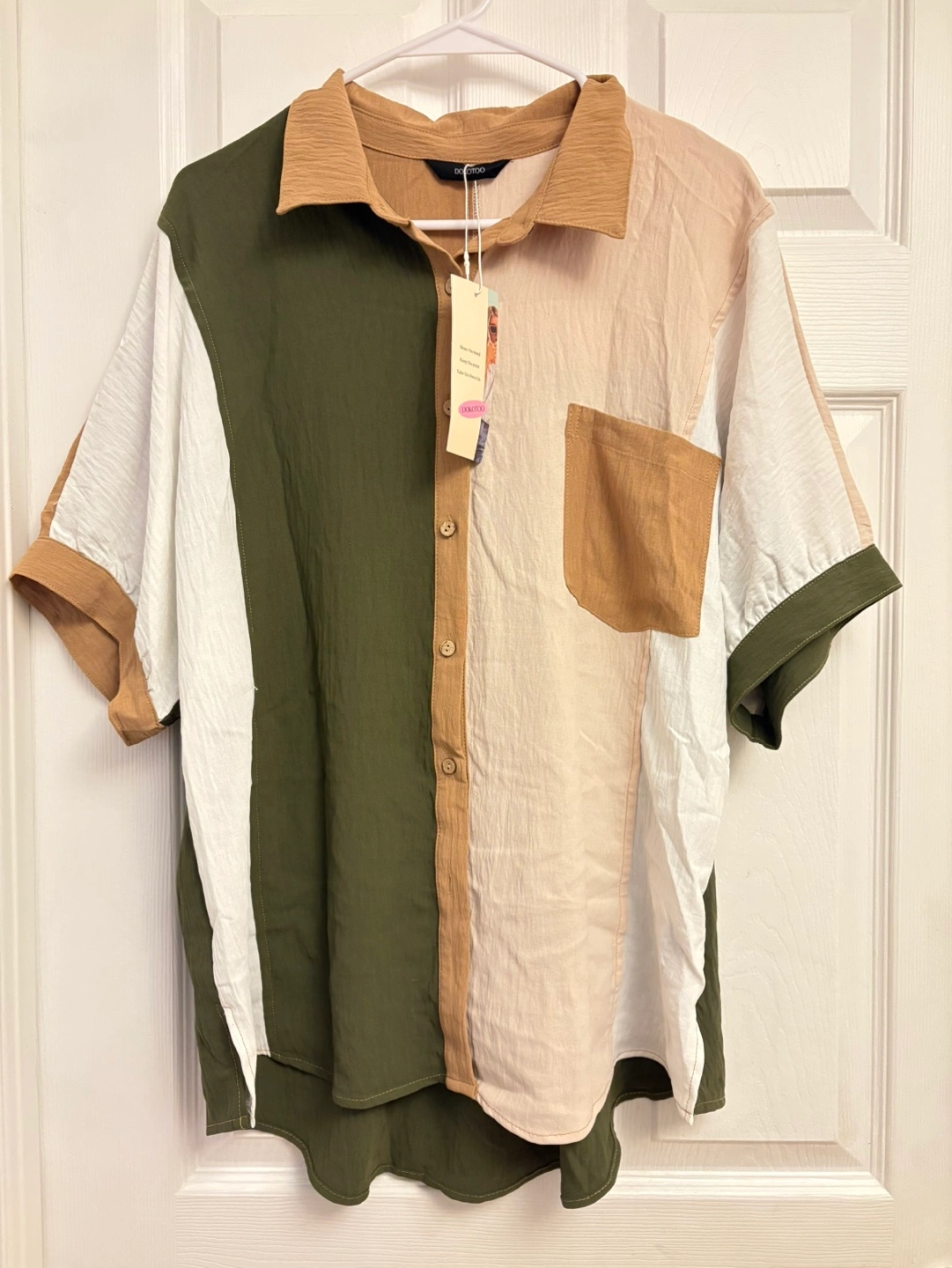 Short sleeve collared button-down shirt. Features a colour block design in olive green, beige and off-white.