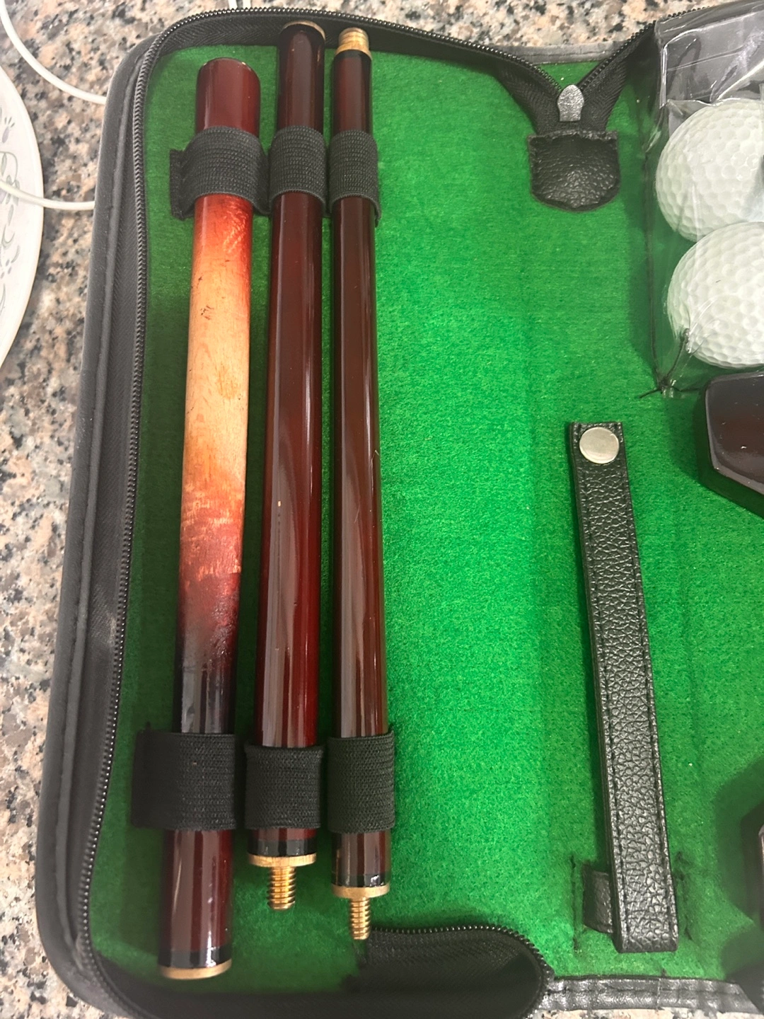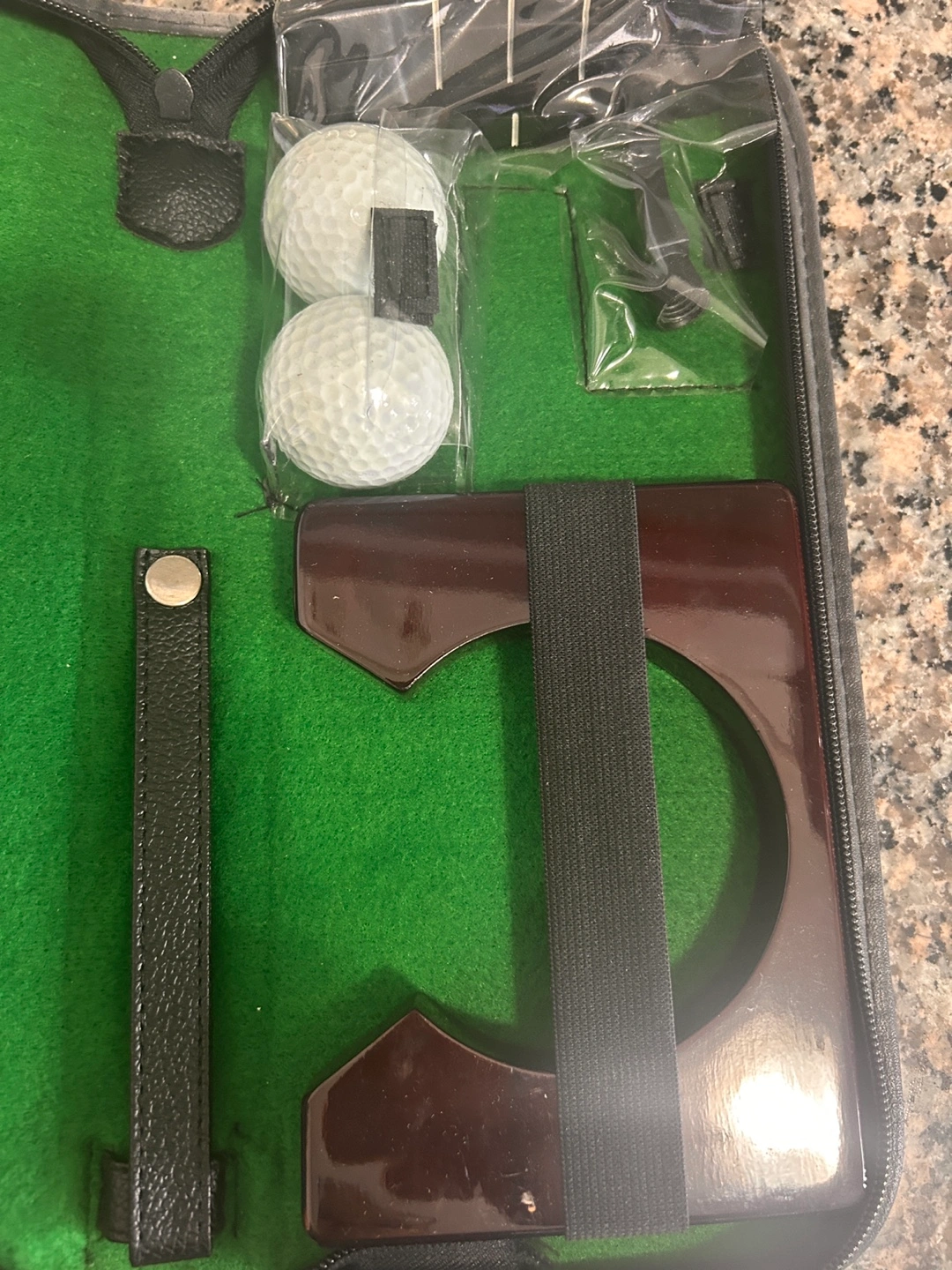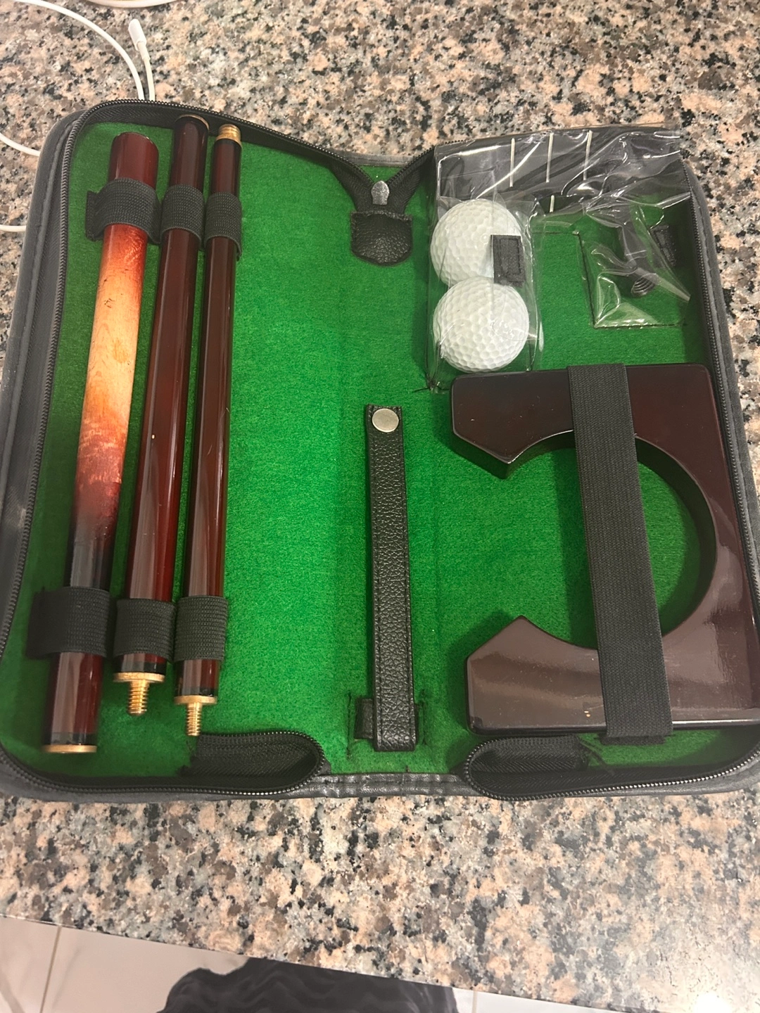 Travel-sized putting set. Includes two putters, two golf balls, and a practice cup. All contained in a zippered carrying case. Great for practicing your putting skills on the go.