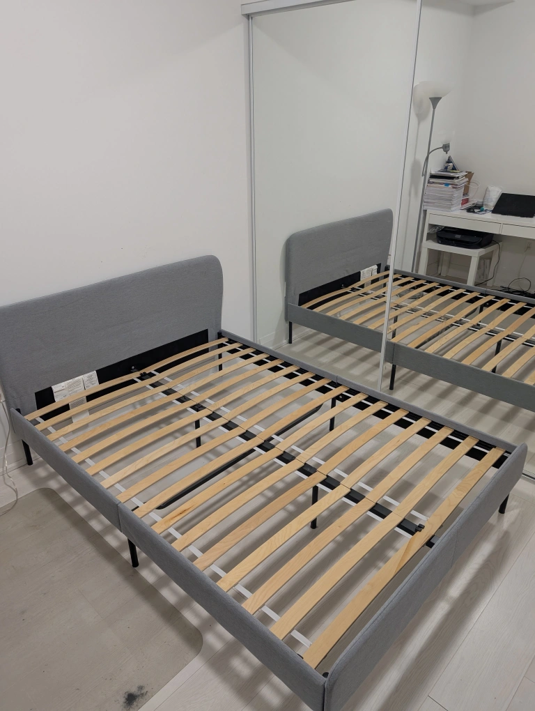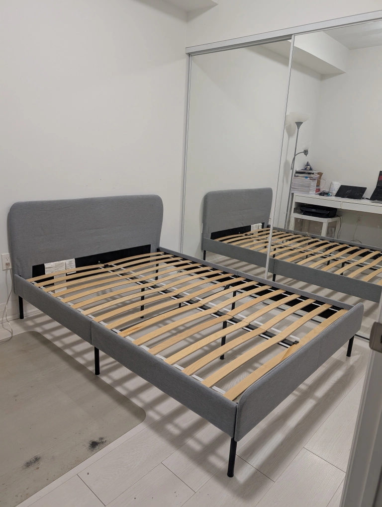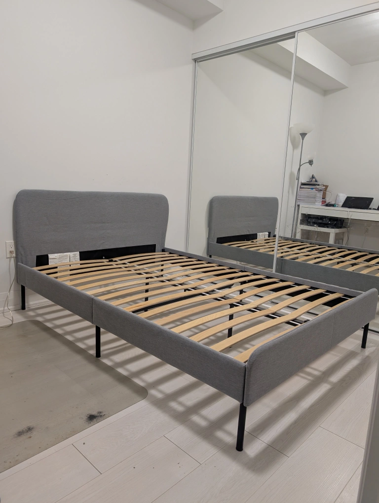 71IKEA SLATTUM Full-size upholstered bed frame. Light gray colour. Perfect condition. Slatted base. Modern Design. One of the best rated ikea beds in this price range. Used as Guest bed, hence it is rarely used and it is just like new and in perfect condition. Easy to disassemble and assemble. SFPF home. Pickup only, no delivery.