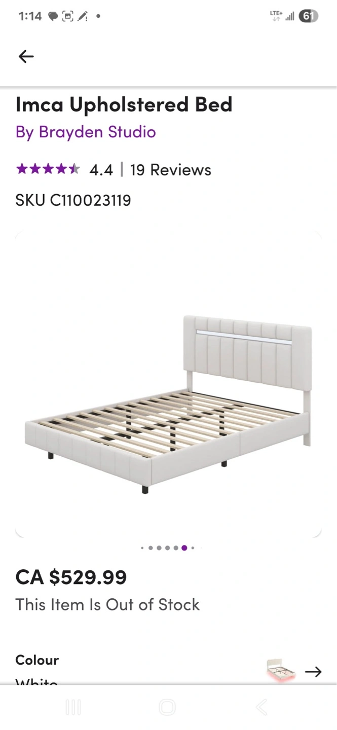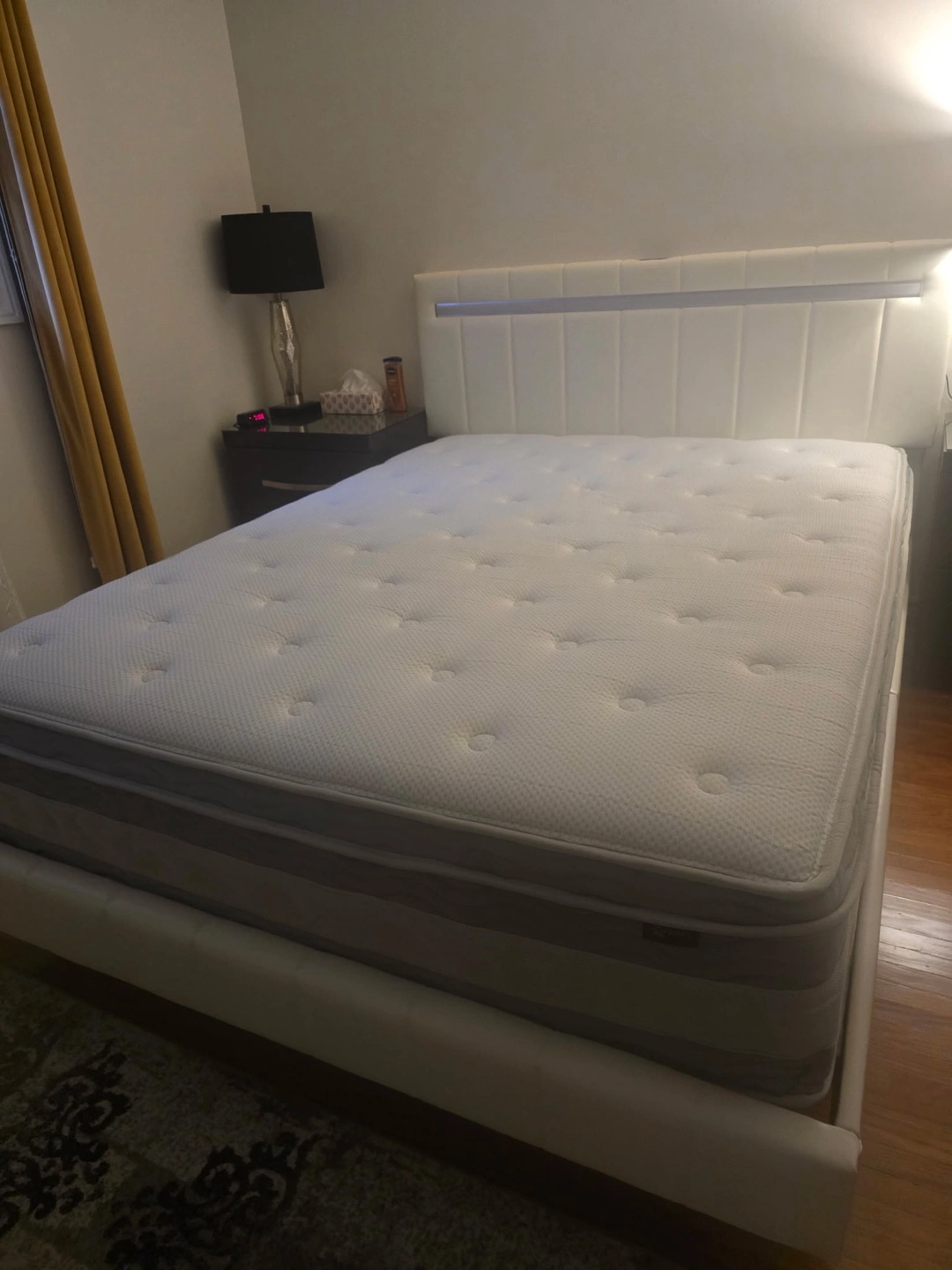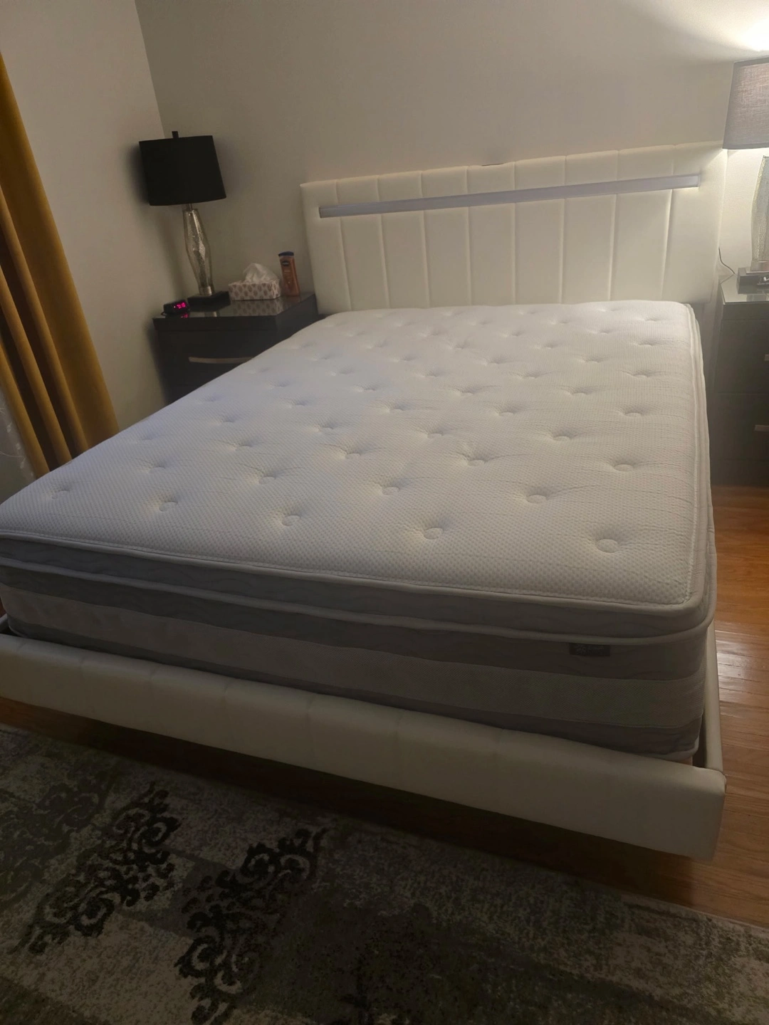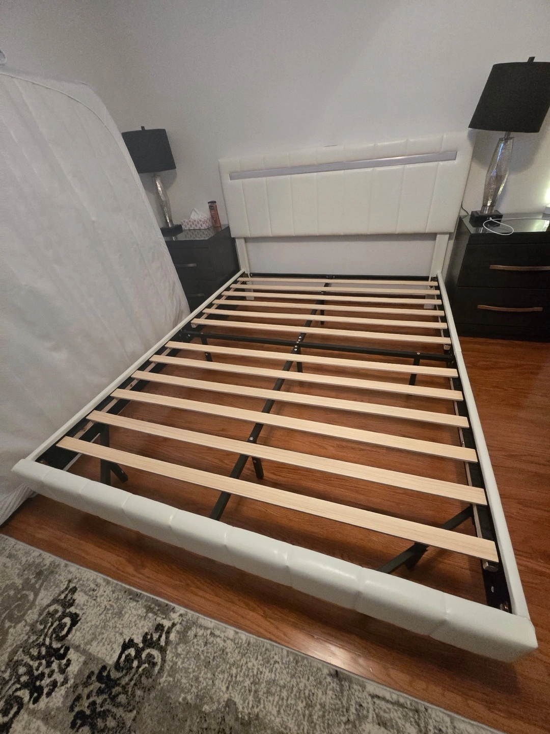 Selling a Brayden Studio Imca Upholstered Bed with a Zinus Queen Mattress, It's in liken new shape and ready for a new home! The bed frame is a stylish white and will fit perfectly in any bedroom. Originally, this bed retailed for $529.99. The mattress itself is $350 It's a comfortable and sturdy bed frame that will provide a good night's sleep. Only used for 3 months and kept extremely clean, we are moving so I’m asking for 500 obo.