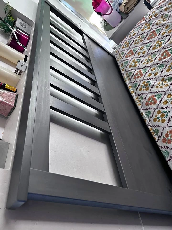 Selling this grey wooden bed frame with drawers underneath. Used for only 6 months, still in really good shape. My sister bought it but she moved back to India, so we don’t need it anymore. ✔️ Sturdy and modern design ✔️ 2 big storage drawers for extra space ✔️ Fits a standard mattress (mattress not included) ✔️ Easy to match with any room décor Pickup only.