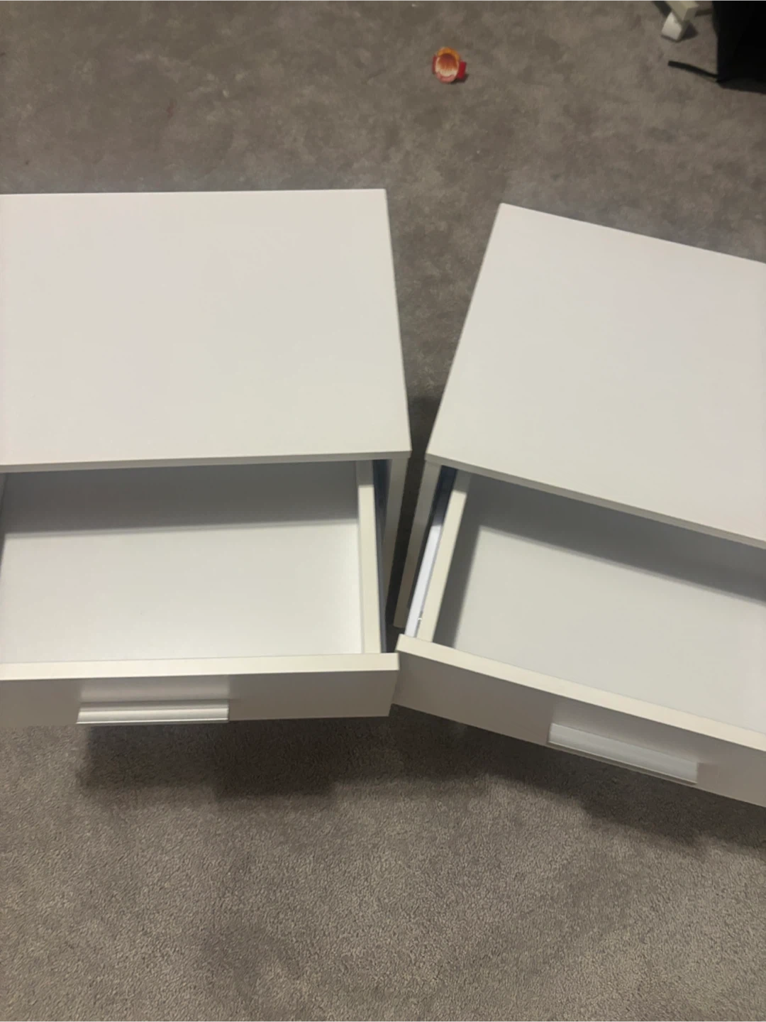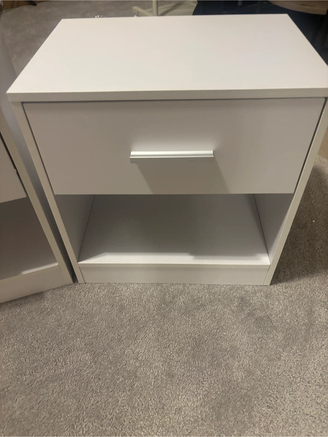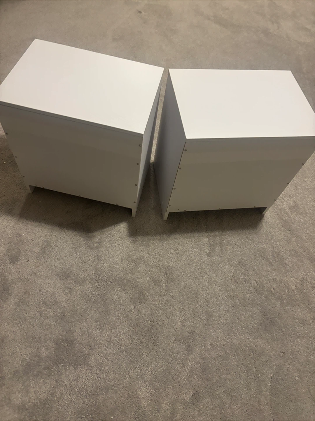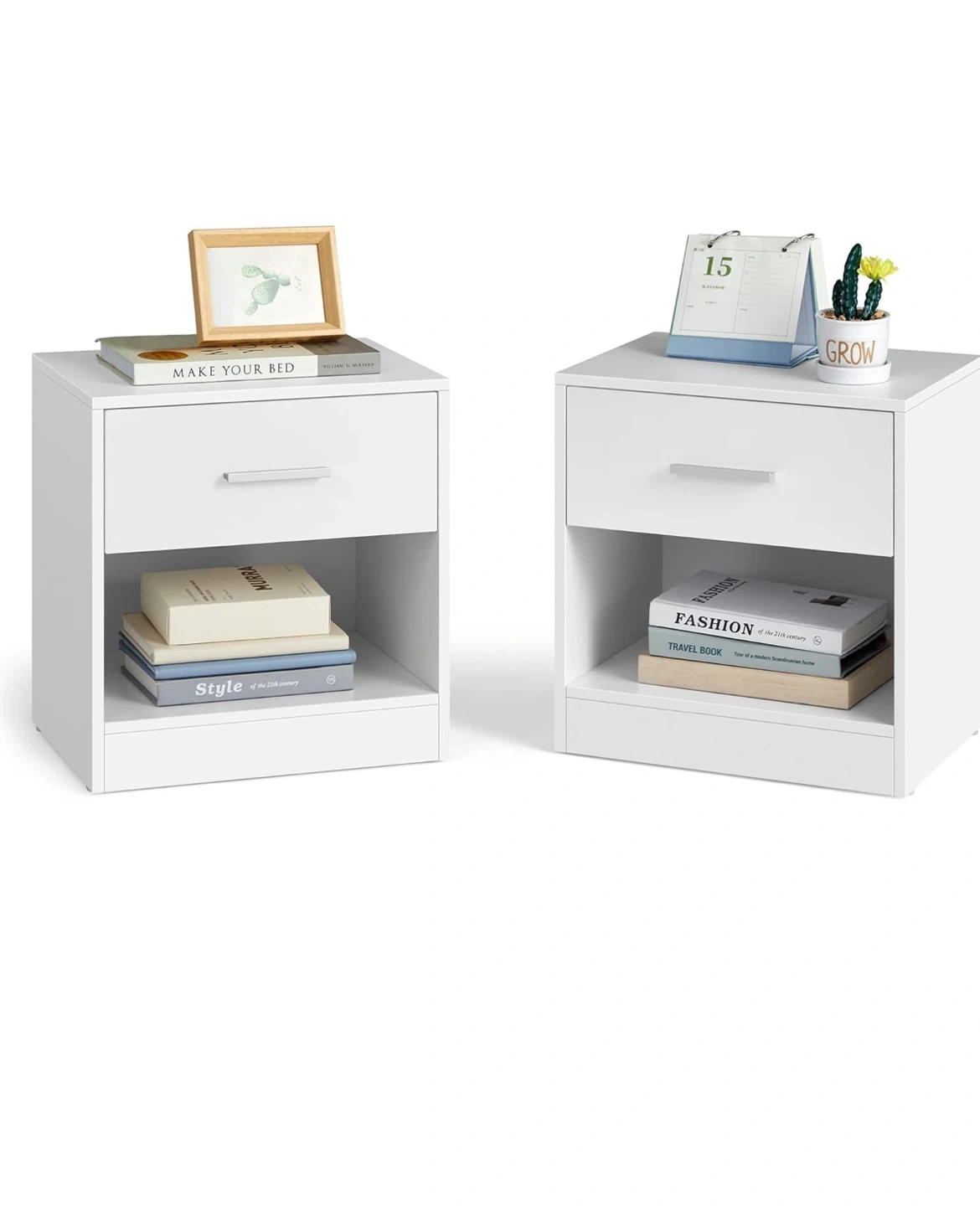 202Selling a set of two cloud white nightstands. They each have a drawer and an open shelf for storage. The dimensions are: - 15.4" (39 cm) wide - 11" (28 cm) deep - 16.1" (41 cm) high Each drawer is: - 13.3" (33.9 cm) wide - 9.8" (25 cm) deep - 2.6" (6.7 cm) high They can hold up to 165 lb (75 kg) total Available for pickup and delivery.