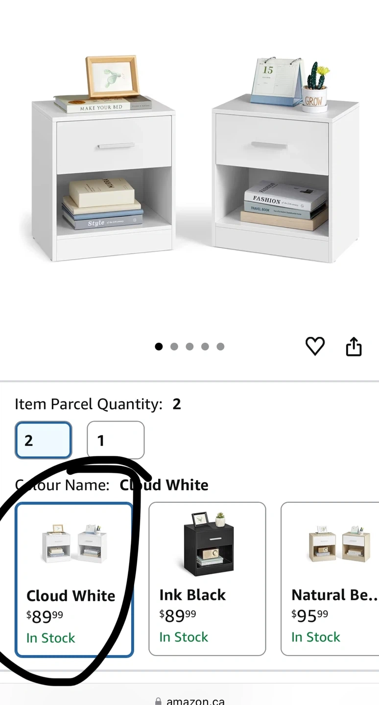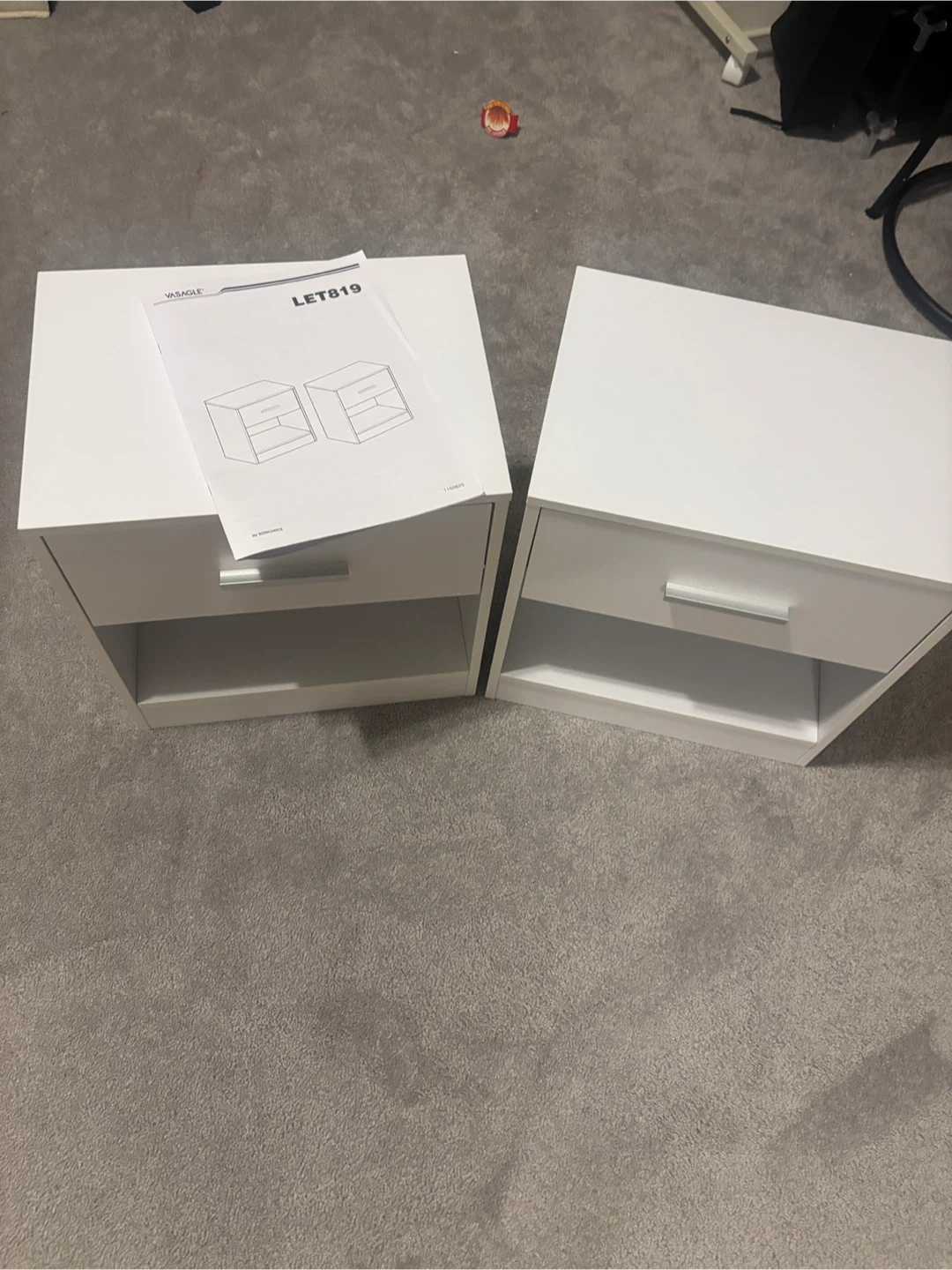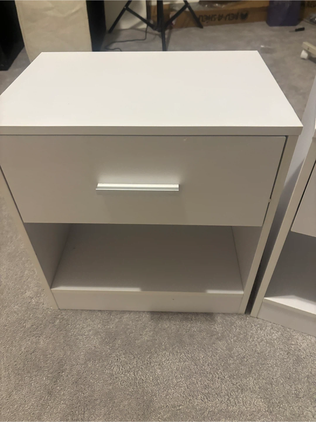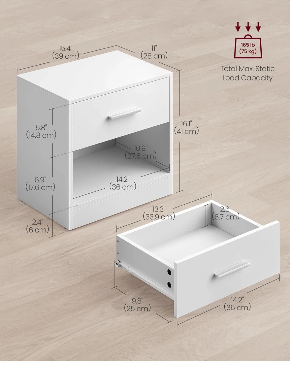 202Selling a set of two cloud white nightstands. They each have a drawer and an open shelf for storage. The dimensions are: - 15.4" (39 cm) wide - 11" (28 cm) deep - 16.1" (41 cm) high Each drawer is: - 13.3" (33.9 cm) wide - 9.8" (25 cm) deep - 2.6" (6.7 cm) high They can hold up to 165 lb (75 kg) total Available for pickup and delivery.