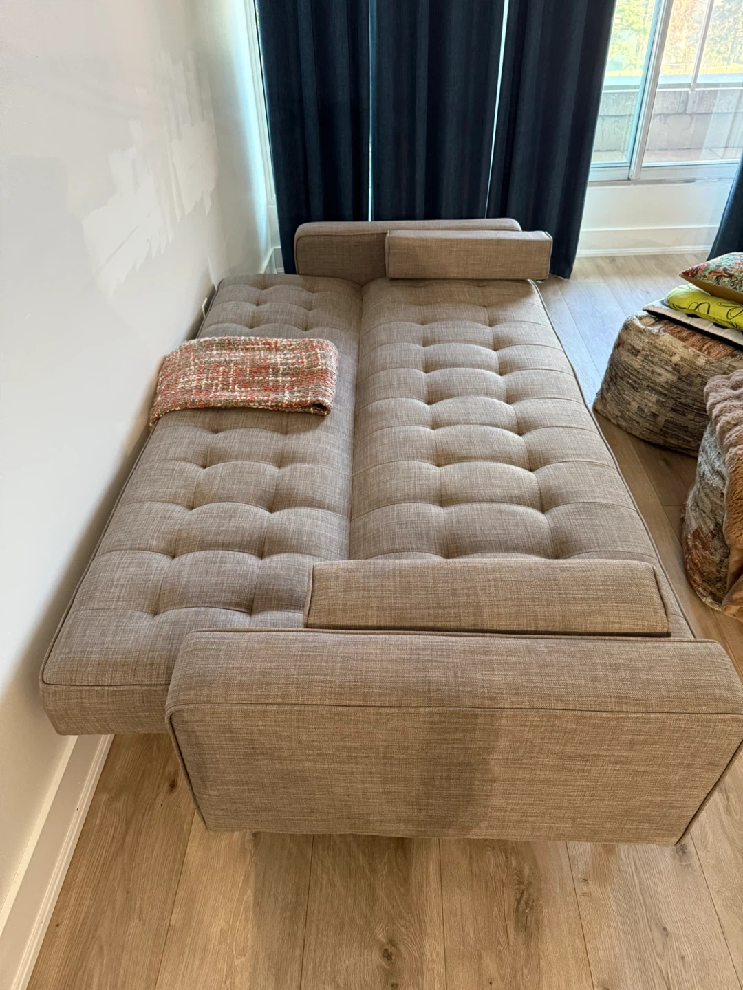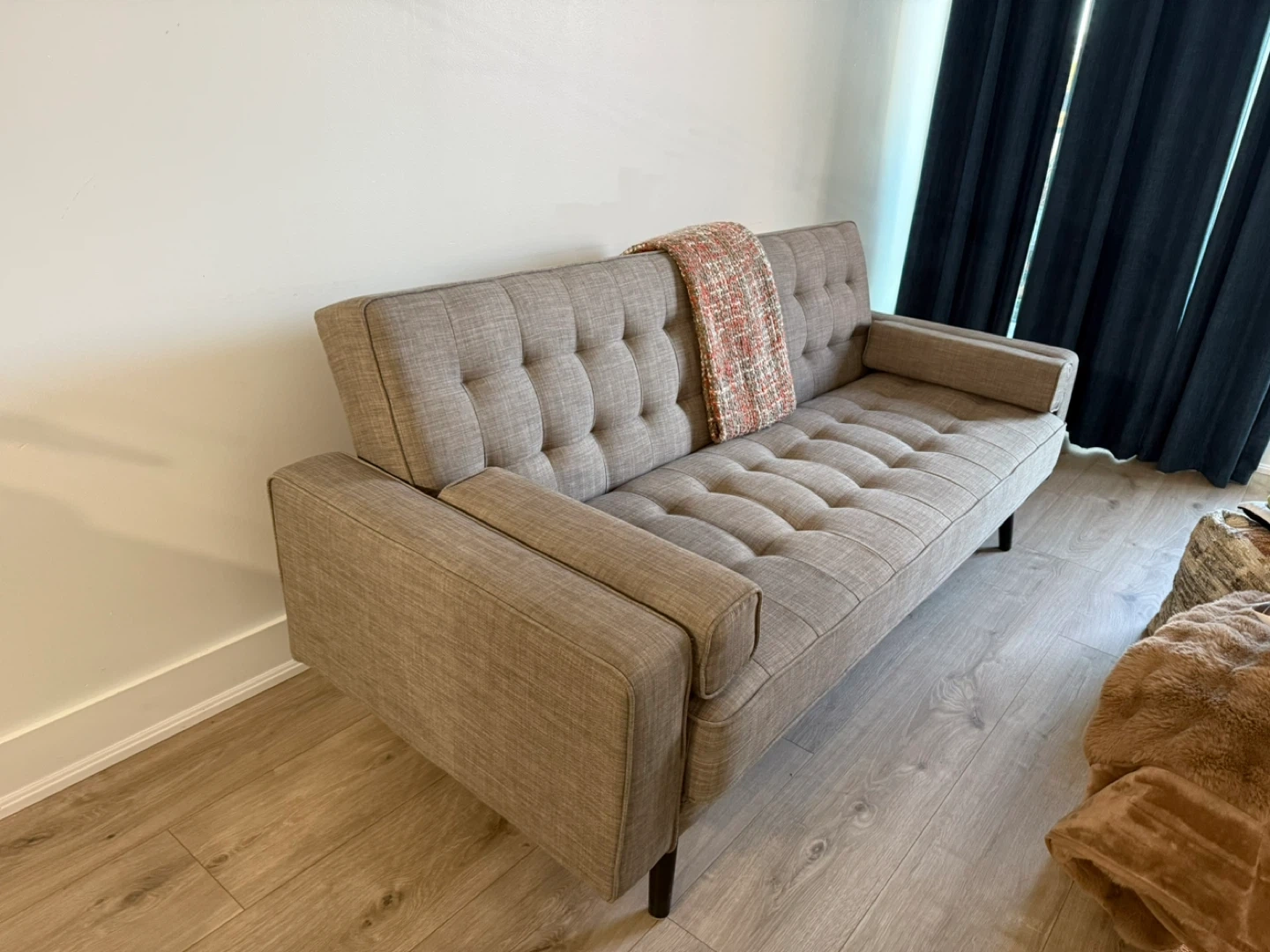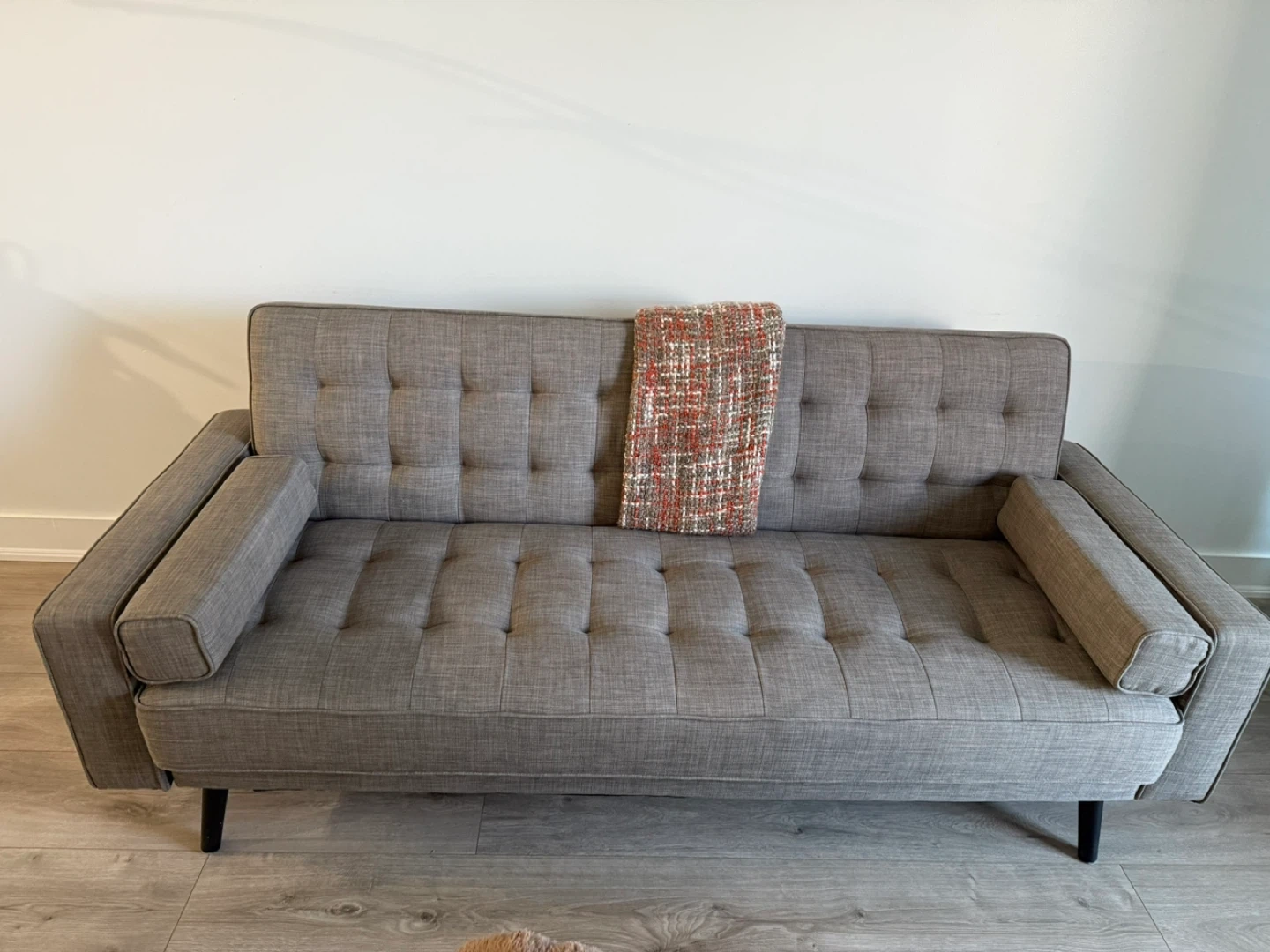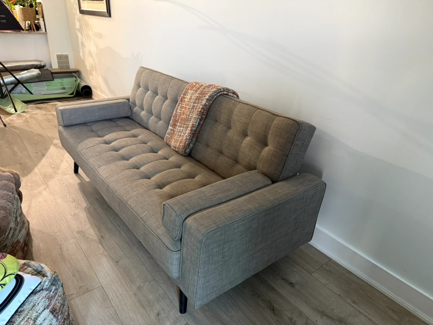 22Selling my barely used Brick bed sofa for $350 New one is $600 + taxes https://www.thebrick.com/products/avery-linen-look-fabric-futon-grey-2 Dimensions Width: 81.5" (207.0 cm) Height: 34.5" (87.6 cm) Depth: 34.5" (87.6 cm) Dapper and dashing, this Avery futon is a stylish addition to your living space. Button tufting on the seat and back show off the plush layers of high-density foam waiting to comfort anyone who takes a load off. Robust linen-look fabric features a grey finish, allowing this piece to blend well with many decor trends while being easy to clean. If your guest needs a snooze, just fold the futon's backrest down and grab them a blanket. Plus, this piece has a retro-modern design and includes two matching armrest cushions to complete the look. Make your home work for you with this Avery futon.