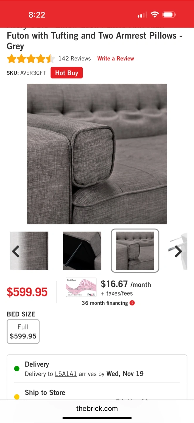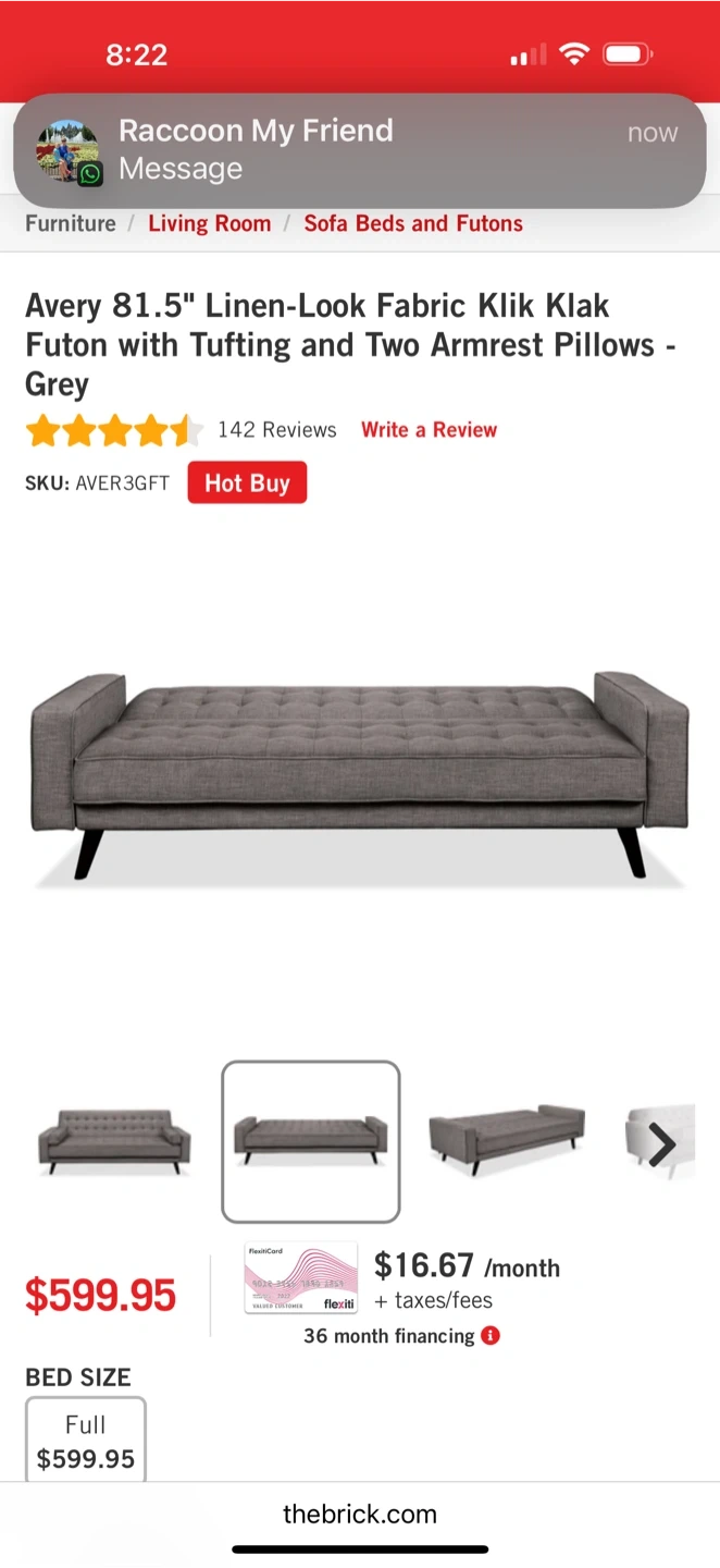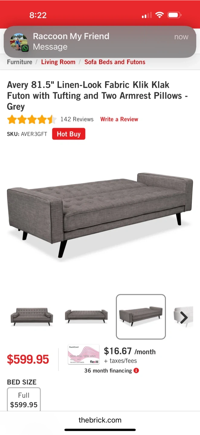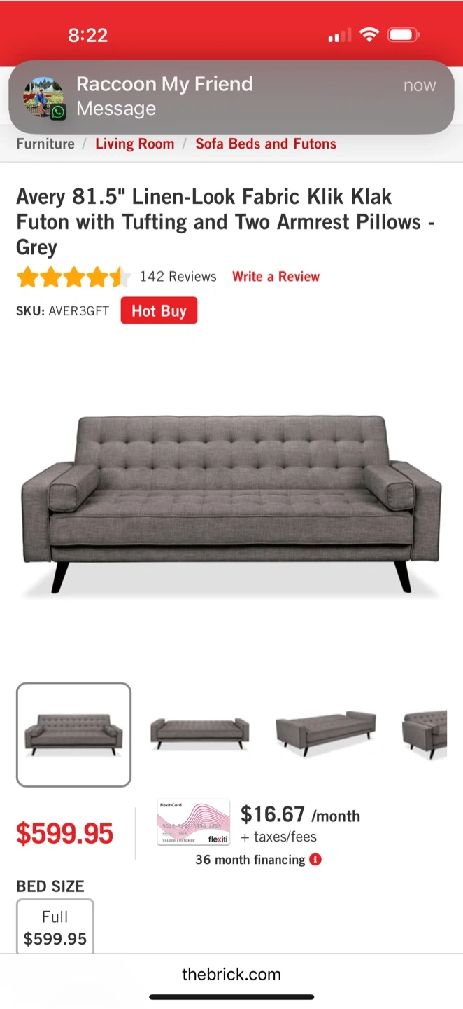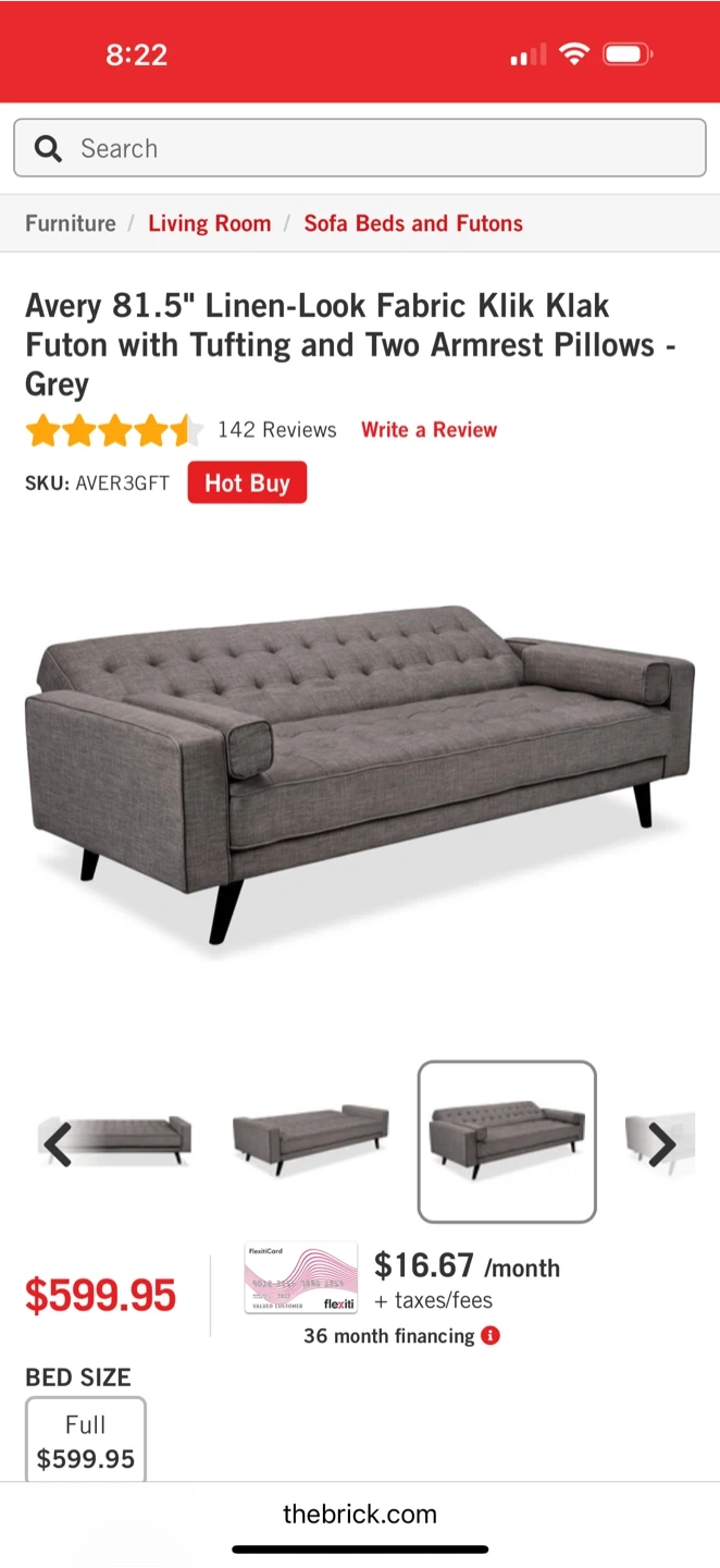 22Selling my barely used Brick bed sofa for $350 New one is $600 + taxes https://www.thebrick.com/products/avery-linen-look-fabric-futon-grey-2 Dimensions Width: 81.5" (207.0 cm) Height: 34.5" (87.6 cm) Depth: 34.5" (87.6 cm) Dapper and dashing, this Avery futon is a stylish addition to your living space. Button tufting on the seat and back show off the plush layers of high-density foam waiting to comfort anyone who takes a load off. Robust linen-look fabric features a grey finish, allowing this piece to blend well with many decor trends while being easy to clean. If your guest needs a snooze, just fold the futon's backrest down and grab them a blanket. Plus, this piece has a retro-modern design and includes two matching armrest cushions to complete the look. Make your home work for you with this Avery futon.