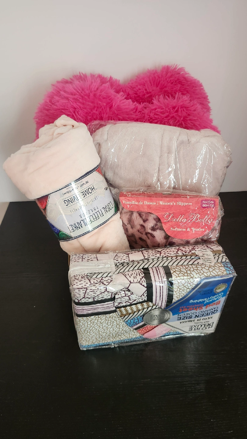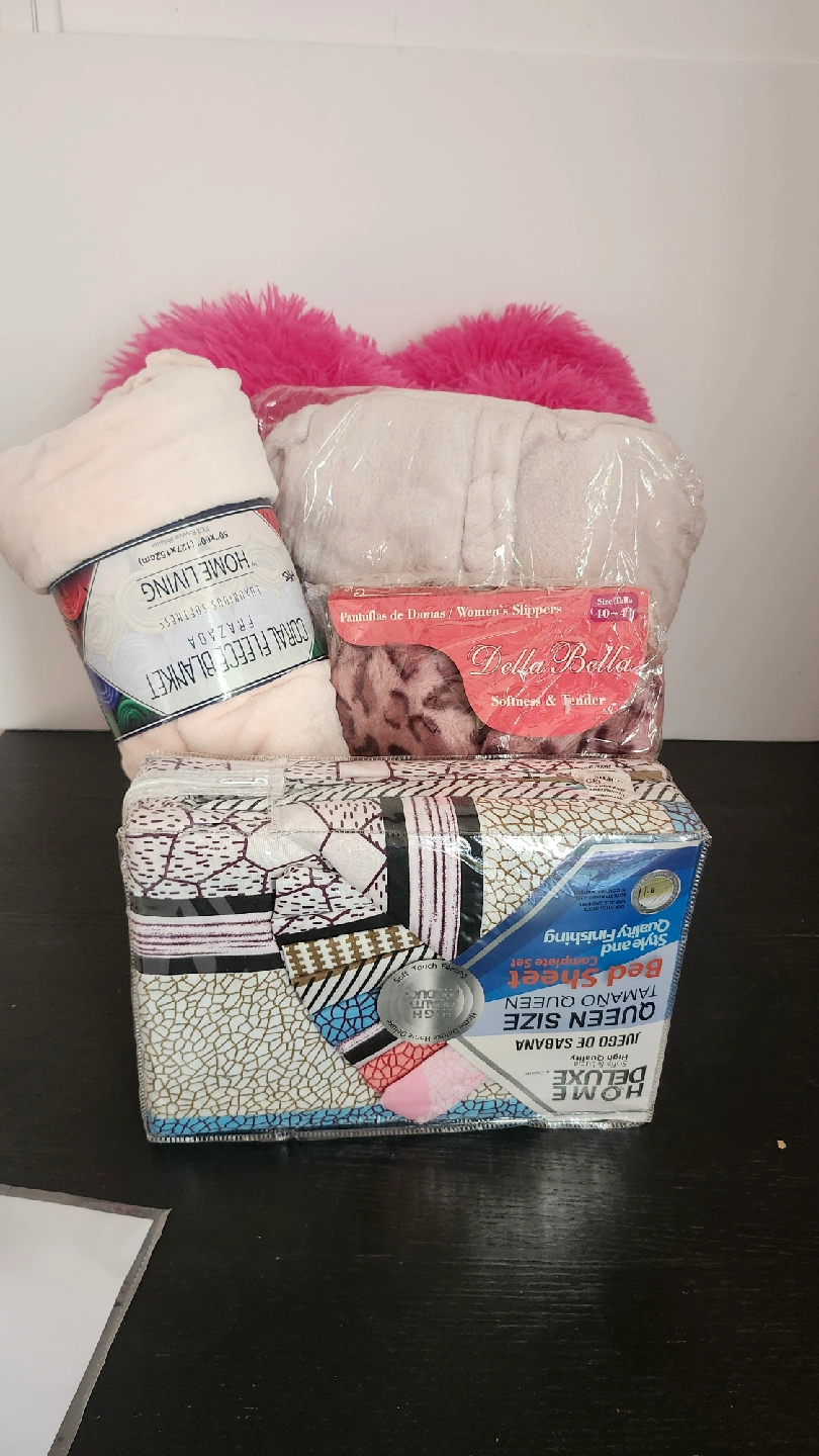 ๐ฉท 2 Heart-Shaped Cushions โ soft, decorative and perfect for bed or sofa ๐ M-Size Bathrobe โ warm and comfy, ideal for relaxing after a shower ๐๏ธ Queen Size Bed Sheet Set โ complete set with pillowcases, fresh and elegant ๐งฃ Soft Throw โ adds a warm touch to your couch or bedroom ๐ฅฟ Comfy Slippers โ cozy and clean, great for home lounging ๐ Everything is new and unused, ideal for yourself or as a thoughtful gift! Price is for the whole set. 9-10)