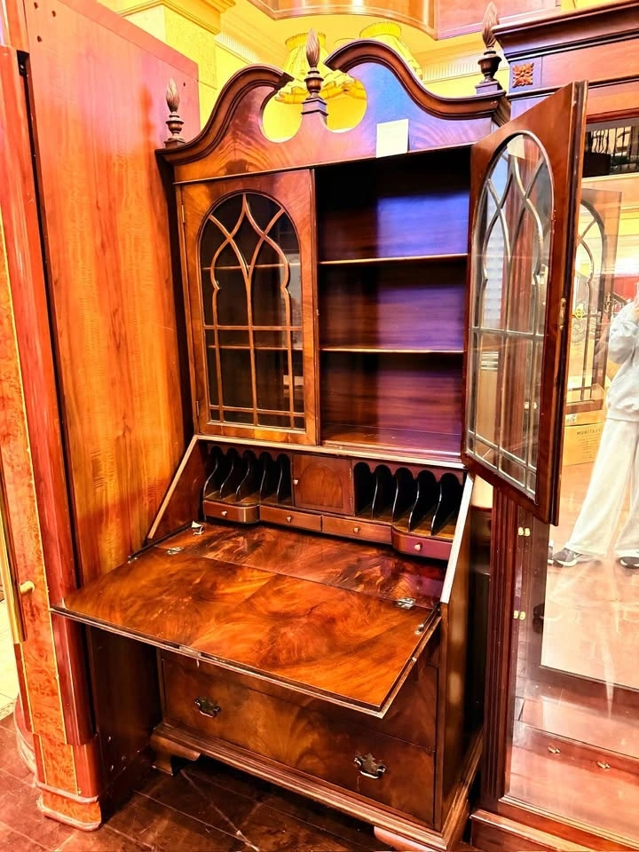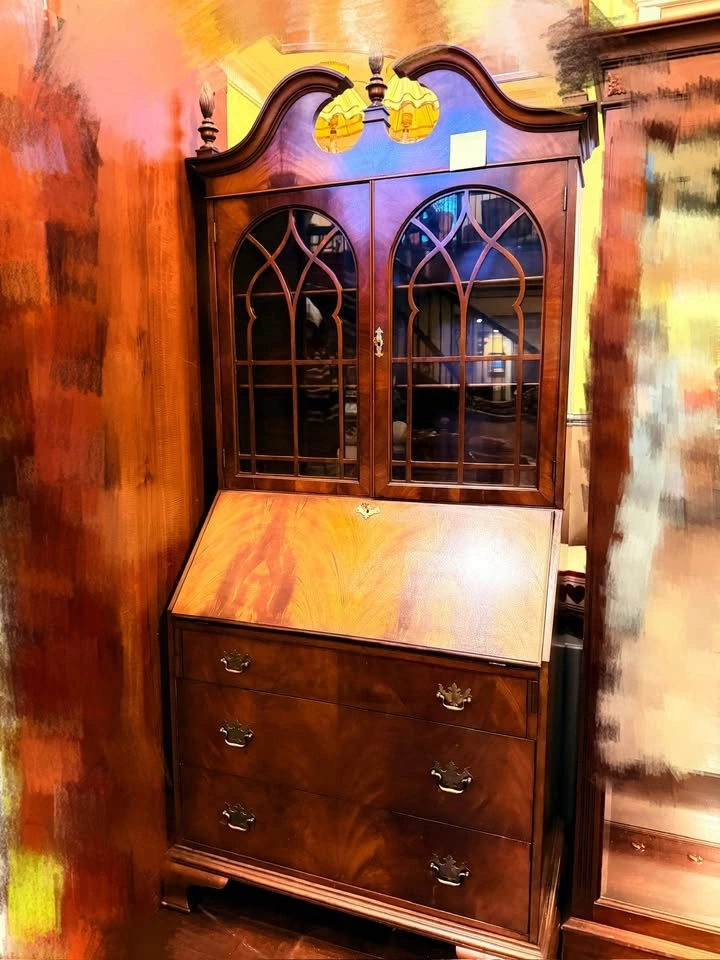Beautiful solid wood desk in a rich, warm brown finish with elegant grain patterns throughout. Features a drop-front writing surface, interior compartments, and glass-paneled doors with decorative detailing. Classic vintage style with light age-appropriate wear, sturdy construction, and smooth-functioning doors and drawers.