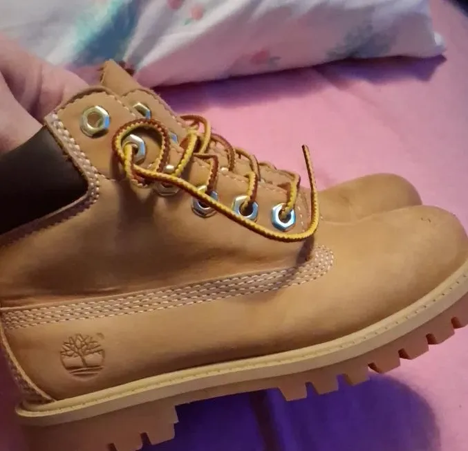 Classic tan nubuck leather Timberland boots. Features a sturdy rubber sole for traction. This style is popular for its durability and timeless look.