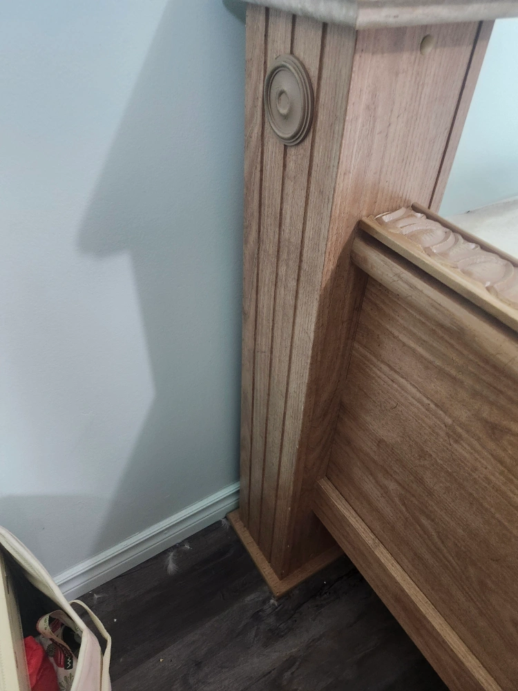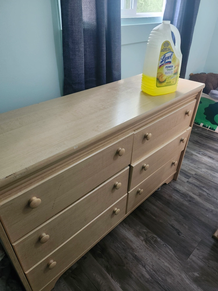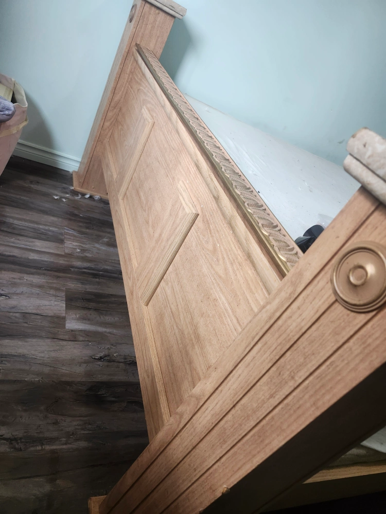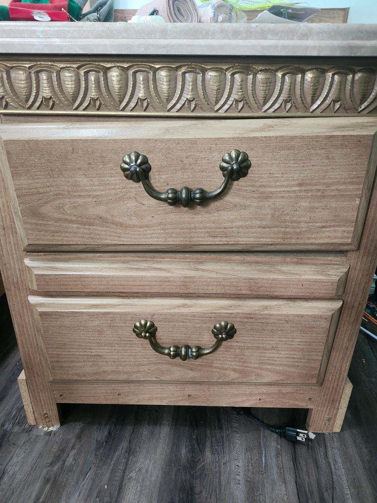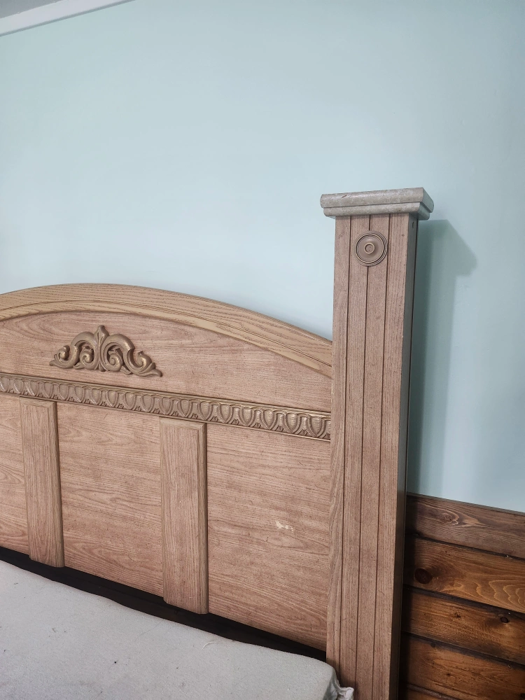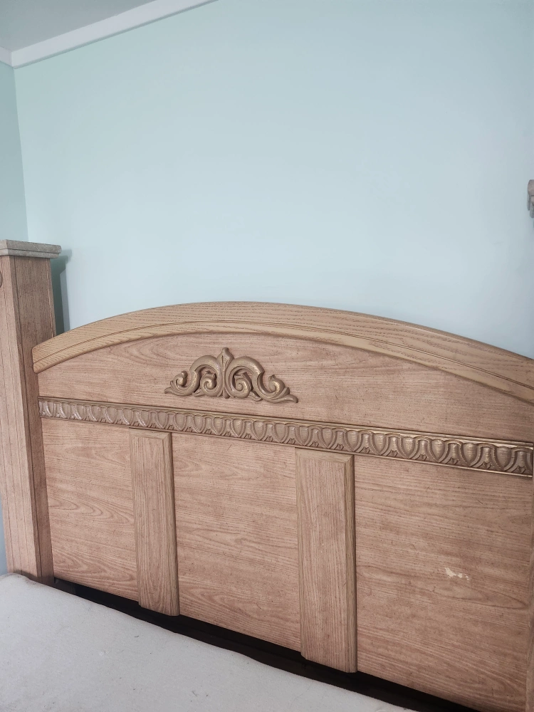 Bed frame with a matching nightstand and dresser. Light-coloured wood construction. Bed frame features a decorative headboard. Nightstand has two drawers with bronze handles. Dresser features multiple drawers for storage, and is a perfect place to place your belongings and find your peace.