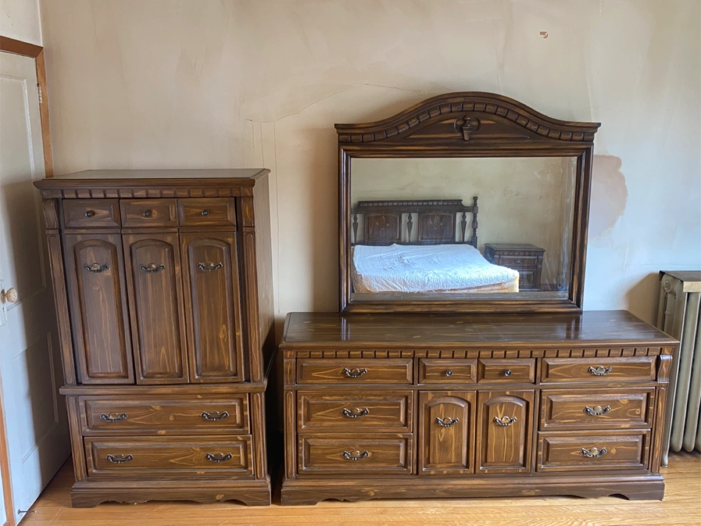 10Selling a set of bedroom and living room furniture. It includes a bed frame with two nightstands, a dresser with a mirror, a chest of drawers, a TV stand, and a coffee table. All the items are in good condition and have a matching wood finish. Perfect for furnishing a new home or upgrading your current space! Please take a look at the photos for details