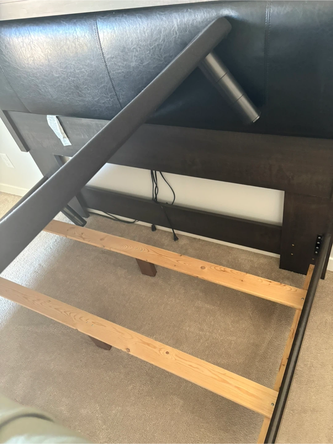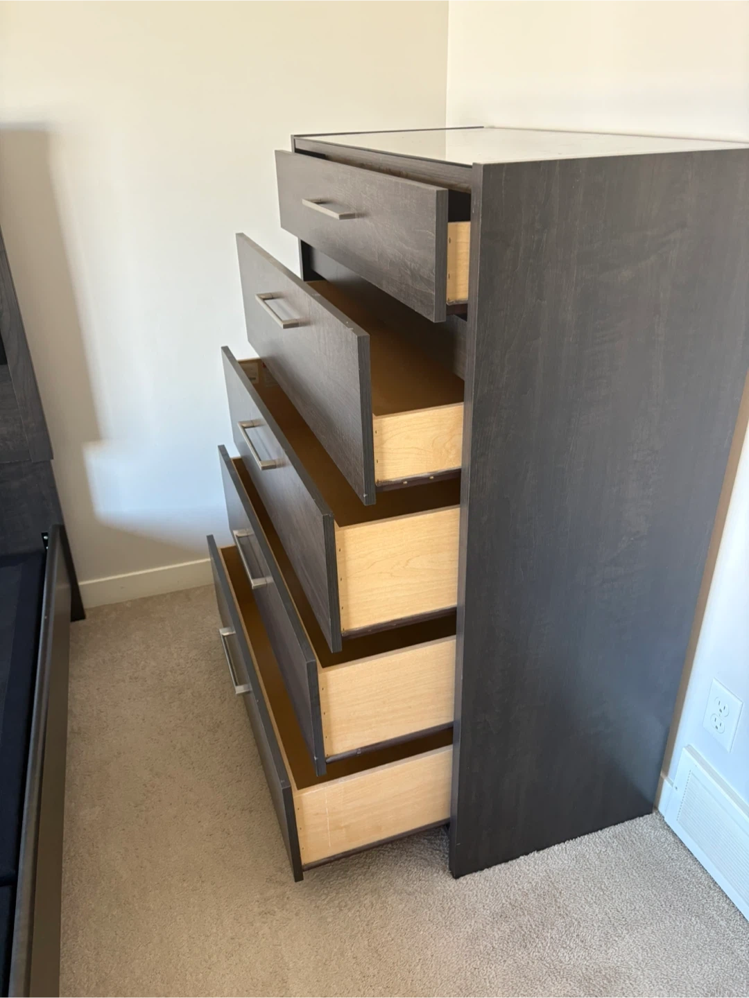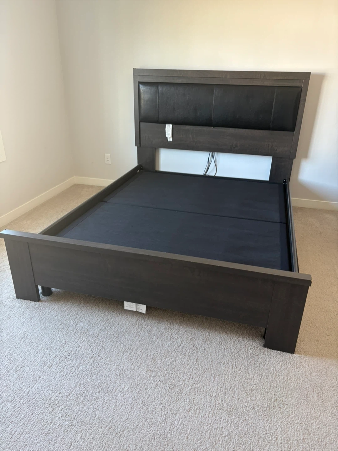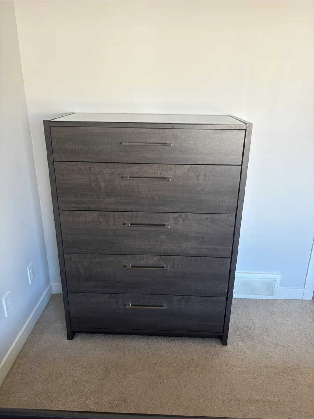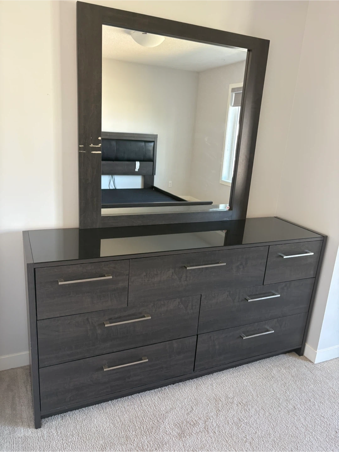 Selling a complete bedroom set that includes a queen bed frame, dresser, and nightstand, also queen mattress. The set features a modern design with a dark wood finish. It's in great condition and ready to enhance your bedroom. Perfect for adding a touch of style and functionality to your space