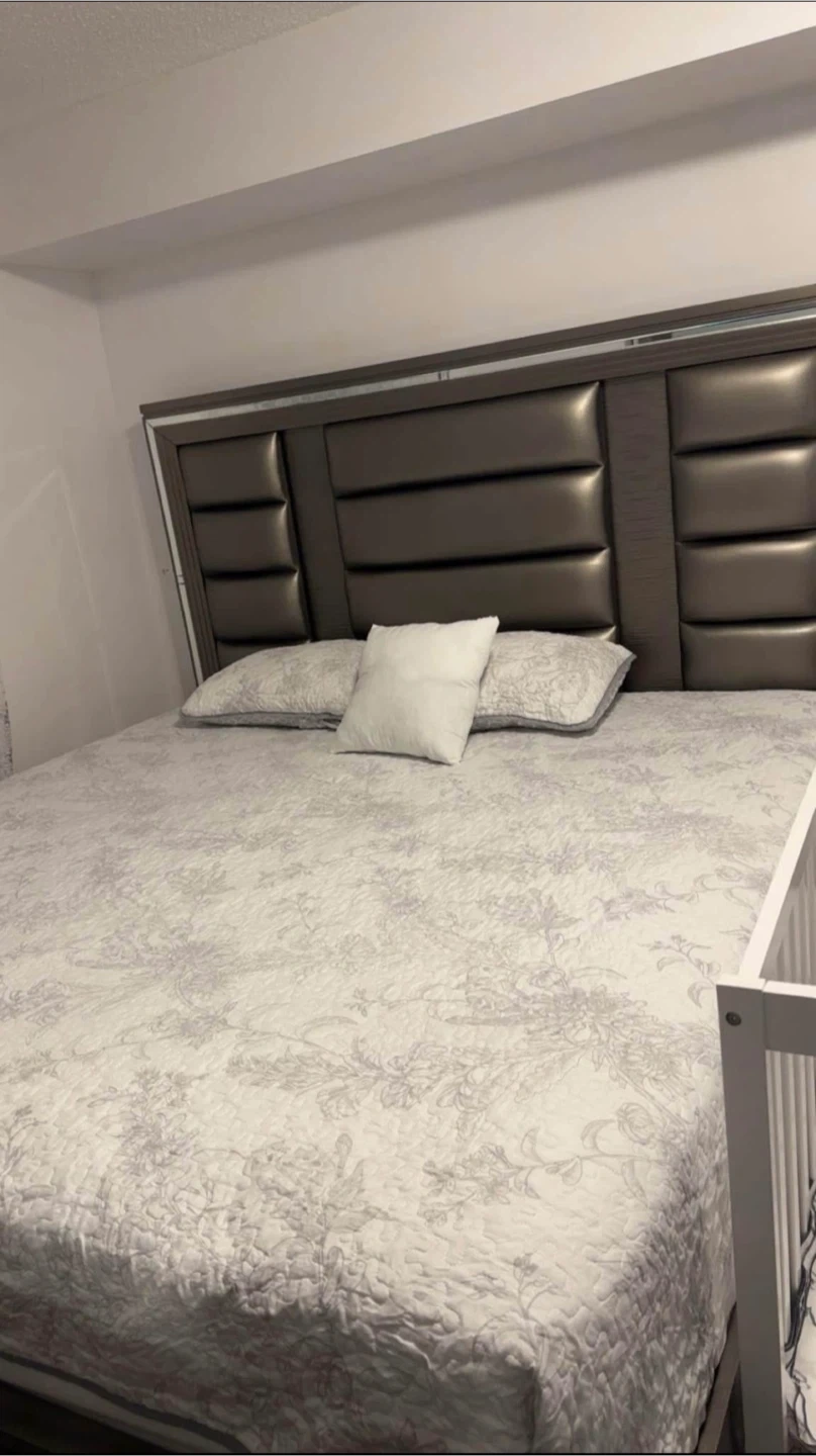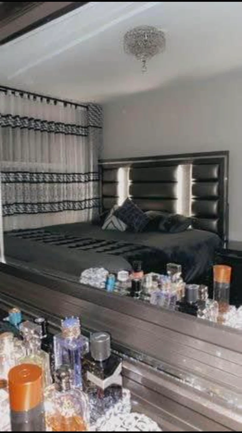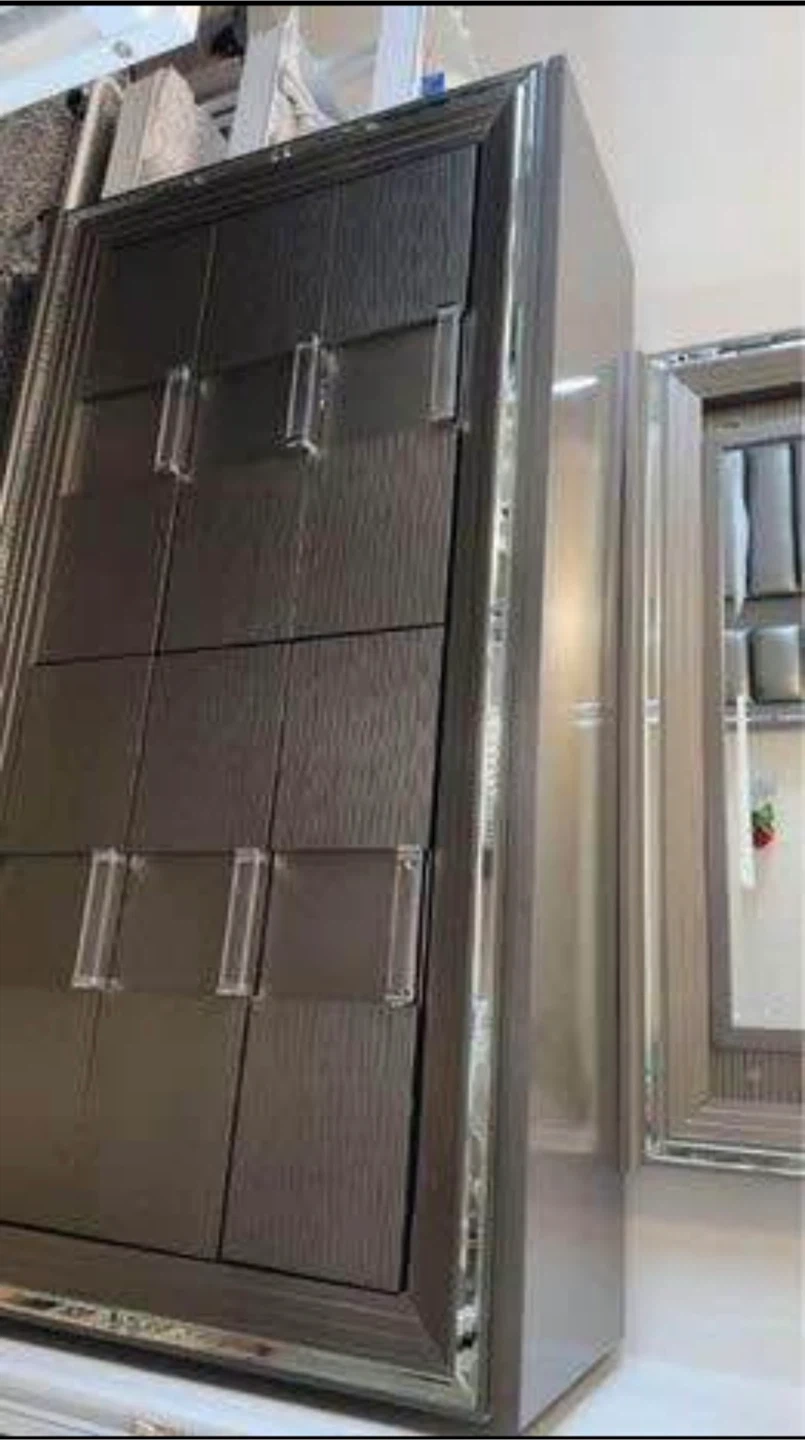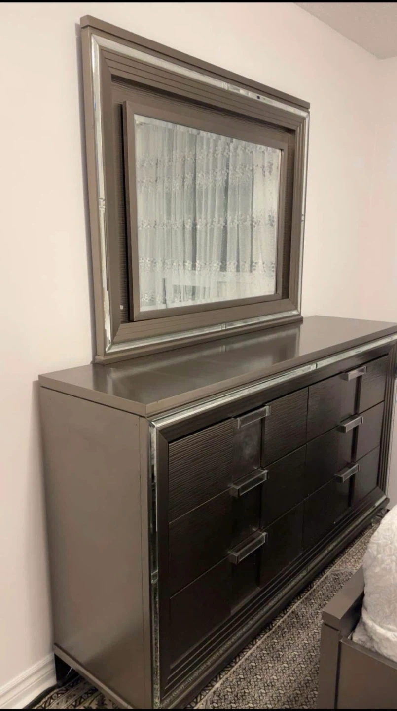 Bedroom set including a bed, dresser, mirror, and nightstand. It features a modern design with a grey finish and mirrored accents. There's a small chip on the bed frame.