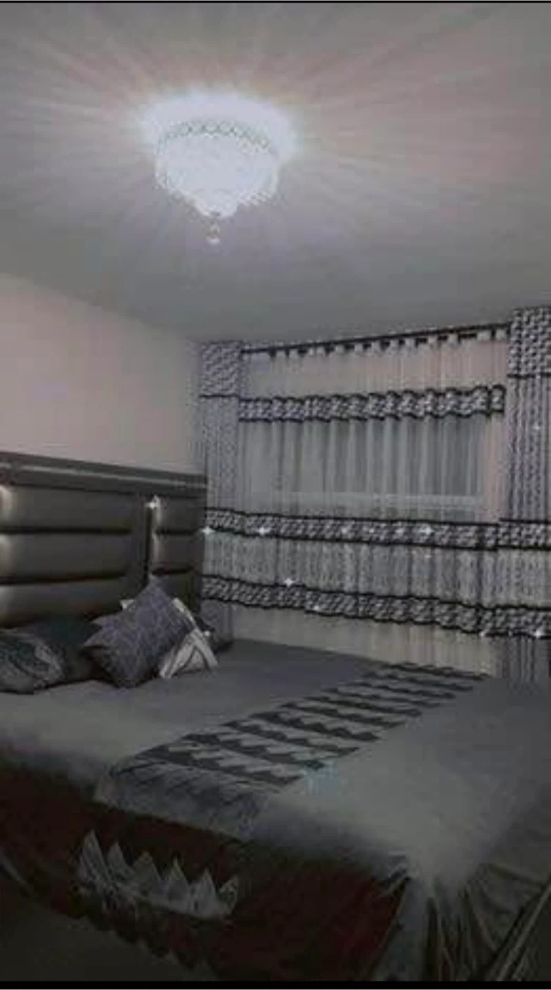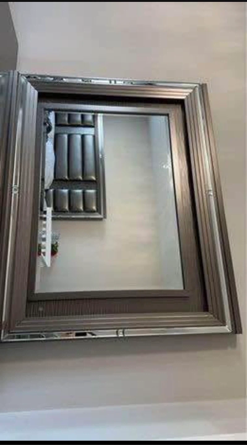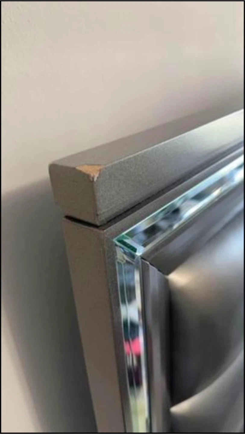 Bedroom set including a bed, dresser, mirror, and nightstand. It features a modern design with a grey finish and mirrored accents. There's a small chip on the bed frame.