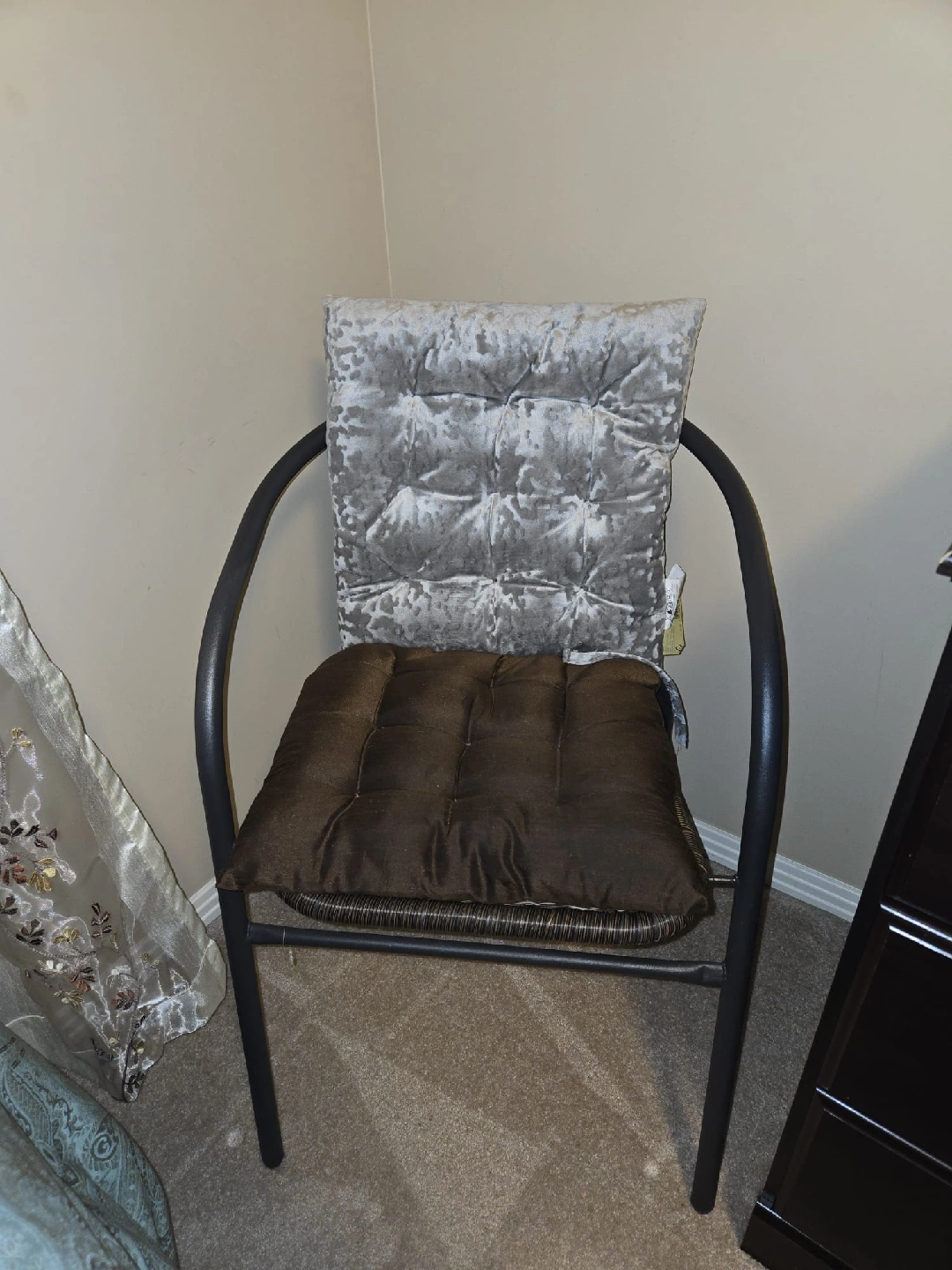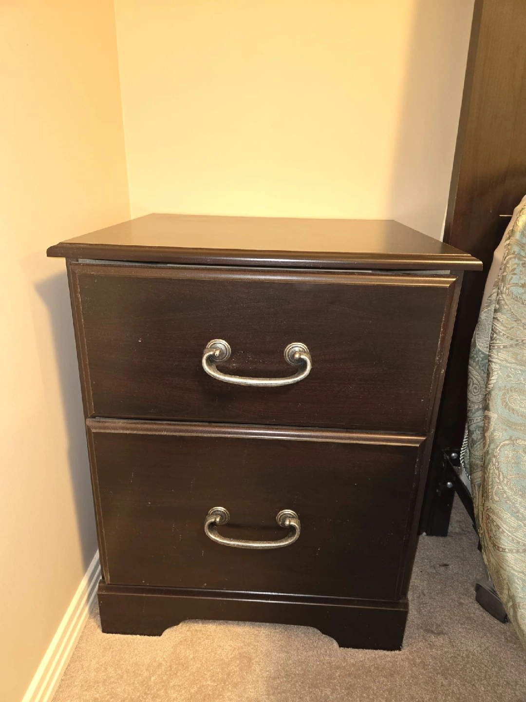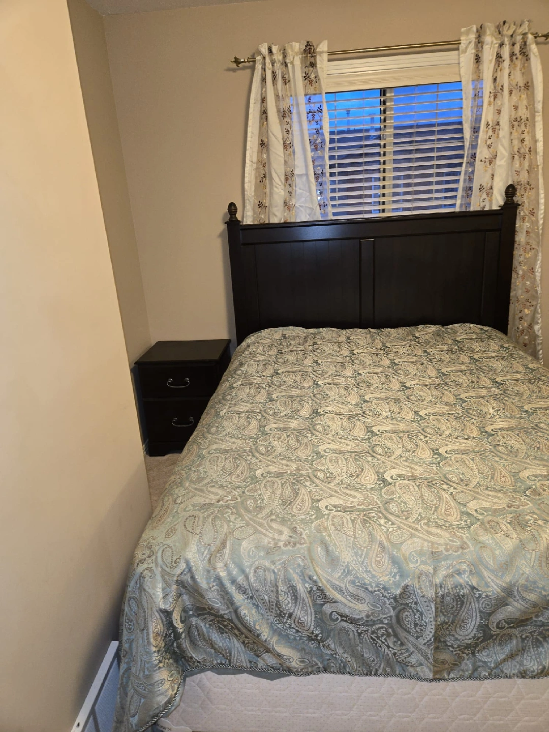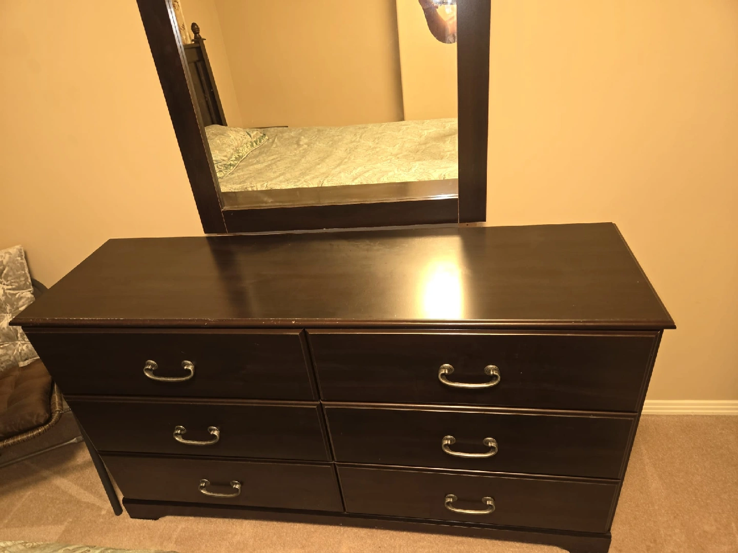 Selling a complete bedroom set! Includes a bed frame, dresser with a mirror, a nightstand, and a chair with cushions. All pieces are in good condition and ready to furnish your space
