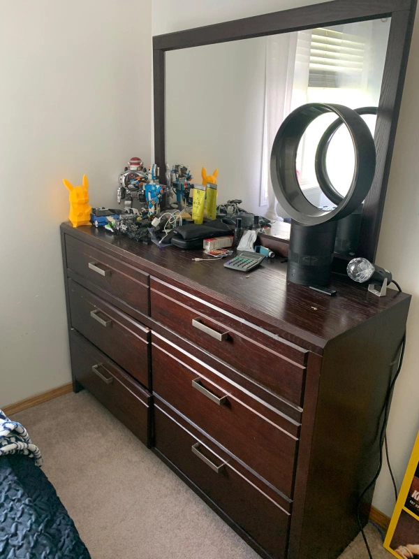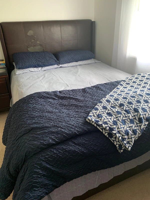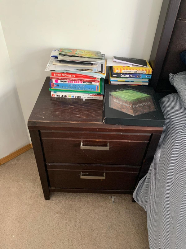 Bedroom set for sale! Includes a bed frame with headboard, a nightstand with two drawers, and a dresser with six drawers. All pieces are matching and in good condition. Perfect for furnishing a bedroom!