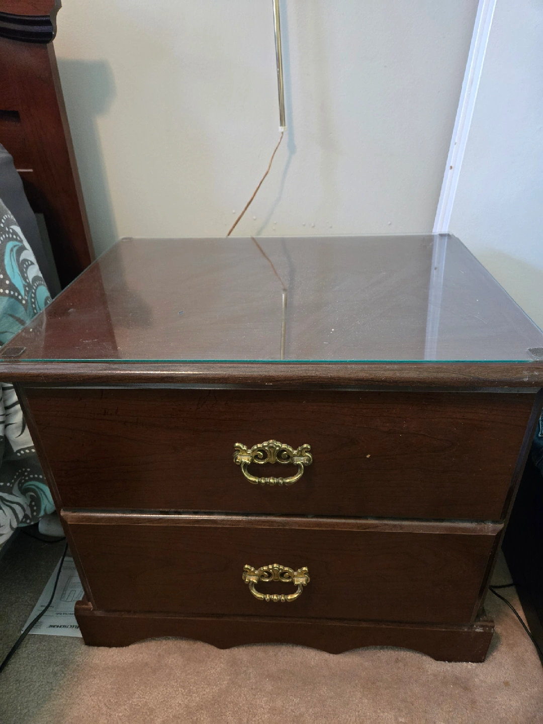 10Selling a bedroom set that includes a dresser with a mirror, a nightstand, and an armoire. All pieces are in good condition and feature a classic design with ornate handles. Perfect for furnishing a bedroom with a matching set!