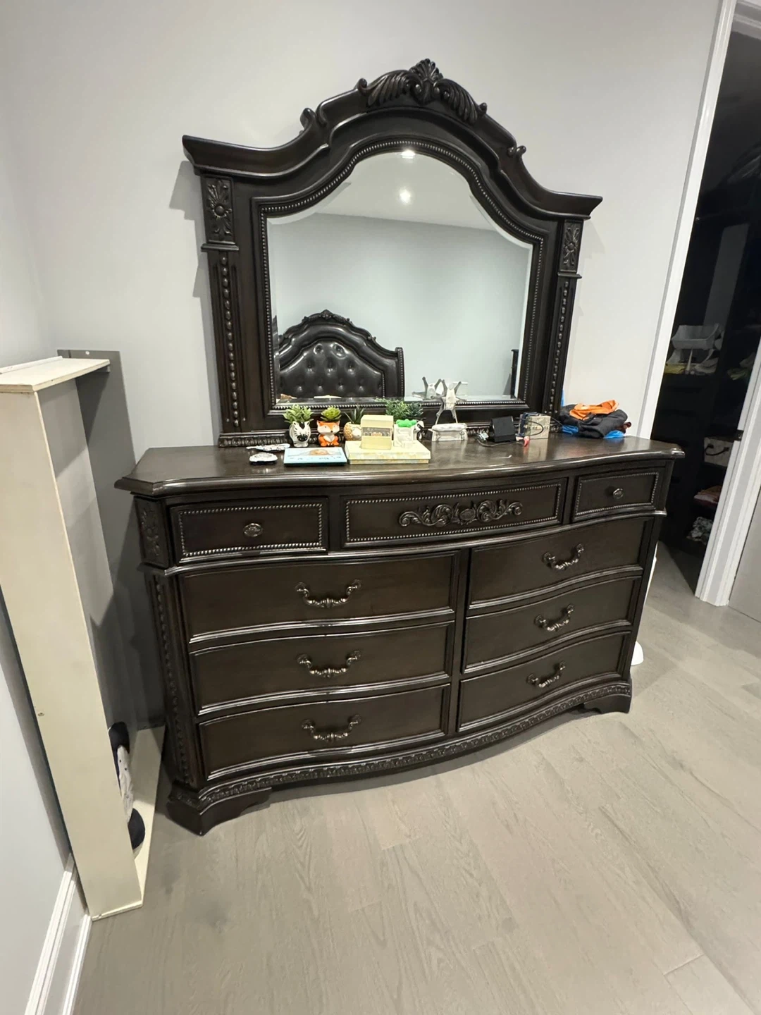 10Selling a beautiful bedroom set that includes a dresser, nightstand, and mirror. The set features a dark wood finish with ornate detailing. It's in great condition and would add a touch of elegance to any bedroom